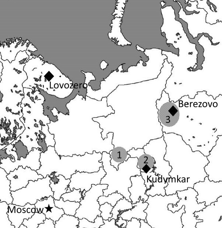 Рис. 1. Географическое положение мест сбора данных. Цифрами обозначены места сбора данных на территориях: 1 — Республика Коми; 2 — Коми-Пермяцкий округ (Пермский край); 3 — Ханты-Мансийский автономный округ — Югра.