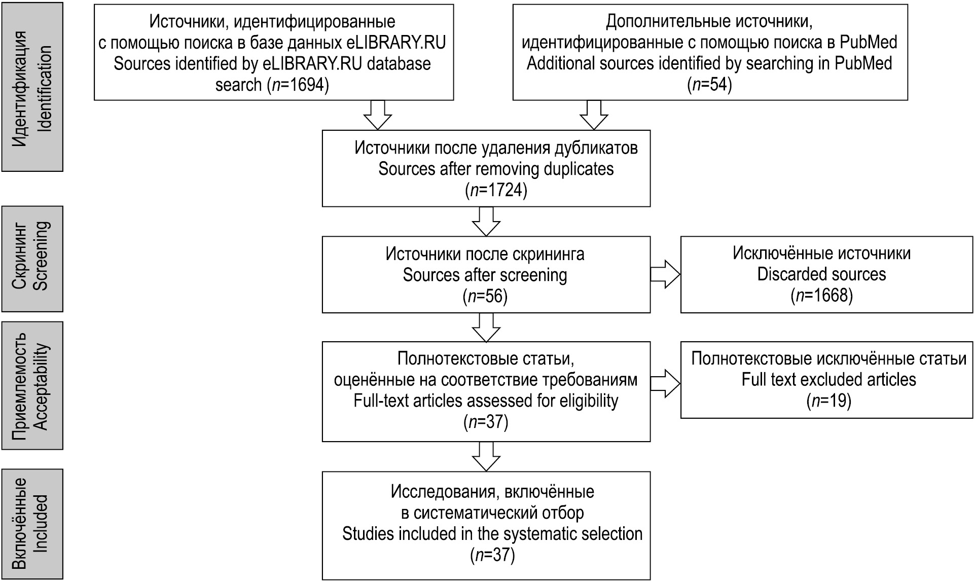 В целом в качественный анализ для систематического обзора было включено 37 оригинальных источников (31 — из eLIBRARY.RU, 6 — из PubMed) (см. рис. 1).