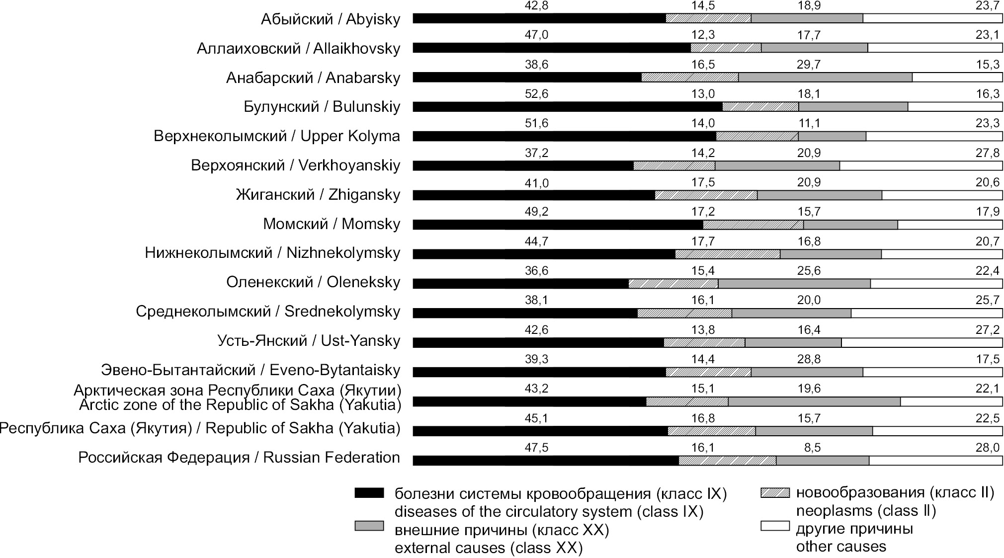 Рис. 2. Структура смертности в 2015–2019 гг. в арктических районах Республики Саха (Якутии) в сравнении с данными в целом по республике и в РФ, %.