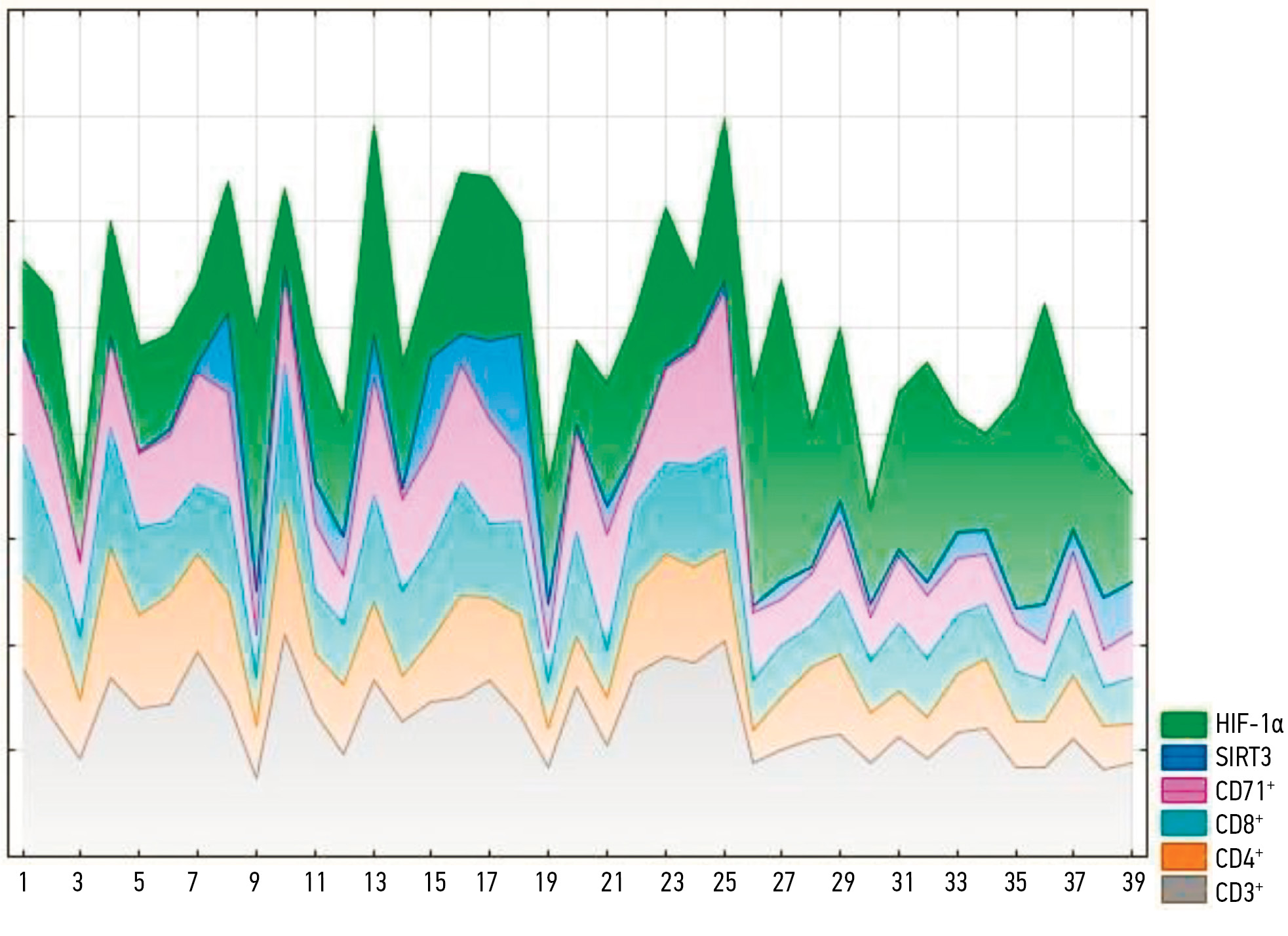 Рис. 1. Последовательные/наложенные графики переменных HIF-1α, SIRT3, CD3+, CD4+, CD8+, CD71+.