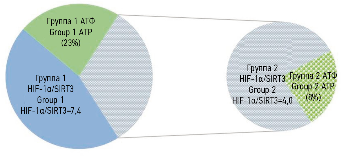 Проведённый кластерный анализ с использованием метода k-средних позволил выделить две группы из числа обследуемых, которые имели статистически значимые различия по всем изучаемым иммунным показателям и HIF-1α, в то время как в отношении SIRT3 таких различий выявлено не было (табл. 1). Следует отметить, что в группе 1 (n=15) при статистически более низких по сравнению с группой 2 (n=24) количественных показателях лимфоцитарного пула рассчитанное отношение HIF-1α к SIRT3 было в 1,9 раза больше, как и концентрация внутриклеточного АТФ. Последняя в среднем составила 3,71 (1,319) и 1,25 (0,387) мкмоль/106 клеток (р <0,0001) в группах 1 и 2 соответственно. Зависимость между соотношением HIF-1α/SIRT3 и АТФ отображена в виде пропорций на круговой диаграмме с выносом анализируемых значений на вторую диаграмму для акцентированной визуализации полученных между группами различий (рис. 3). Эта зависимость иллюстрирует, что с изменением соотношения HIF-1α/SIRT3 согласованно меняется количество АТФ (повышается или снижается).
