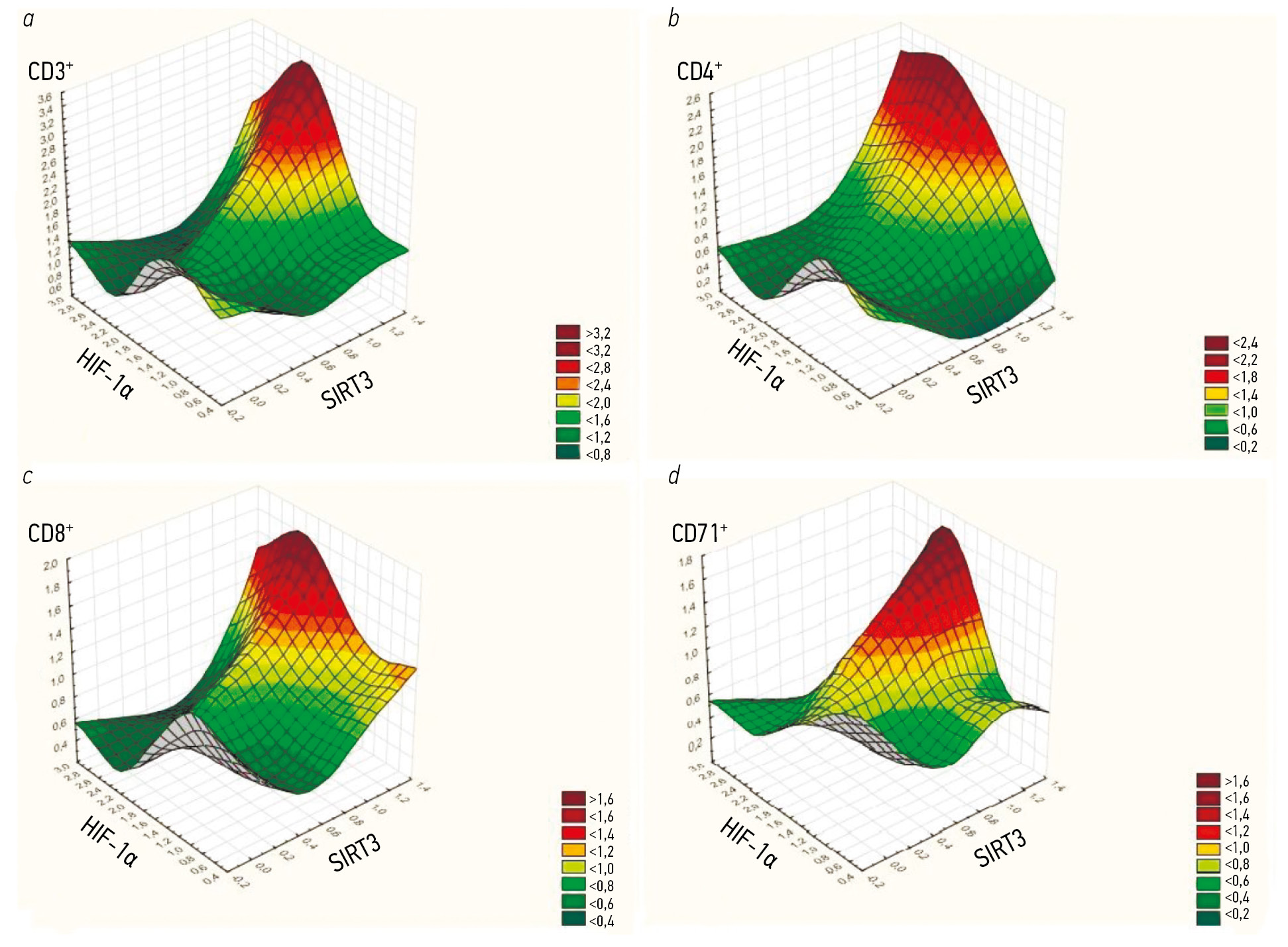 Был установлен характер флуктуаций значений определяемых показателей с помощью построенных последовательно и без перекрытия 2М-графиков, которые включали все определяемые случаи (рис. 1). Отображённый результат наложения графиков отражает однонаправленность колебаний содержания клеток CD3+, CD4+, CD8+, CD71+ и концентраций внутриклеточных регуляторов (HIF-1α, SIRT3). Визуализация зависимости от уровня регуляторов метаболизма изменений количества лимфоцитов с рецепторами СD3, СD4, СD8, СD71 была получена с помощью статистических 3М-графиков поверхностей, построенных в осях XYZ, где Х — концентрация SIRT3, Y — концентрация HIF-1α и Z — содержание лимфоцитов (рис. 2). Как видно из графиков, наибольшие количества лимфоцитов с каждым из определяемых дифференцировочных антигенов наблюдаются на высоте концентраций регуляторов метаболизма, при этом график, отражающий содержание клеток СD4+ (рис. 2, b), имеет сдвиг высоты площади поверхности в сторону оси Y (HIF-1α), что указывает на выраженную зависимость от гликолитического пути метаболизма.