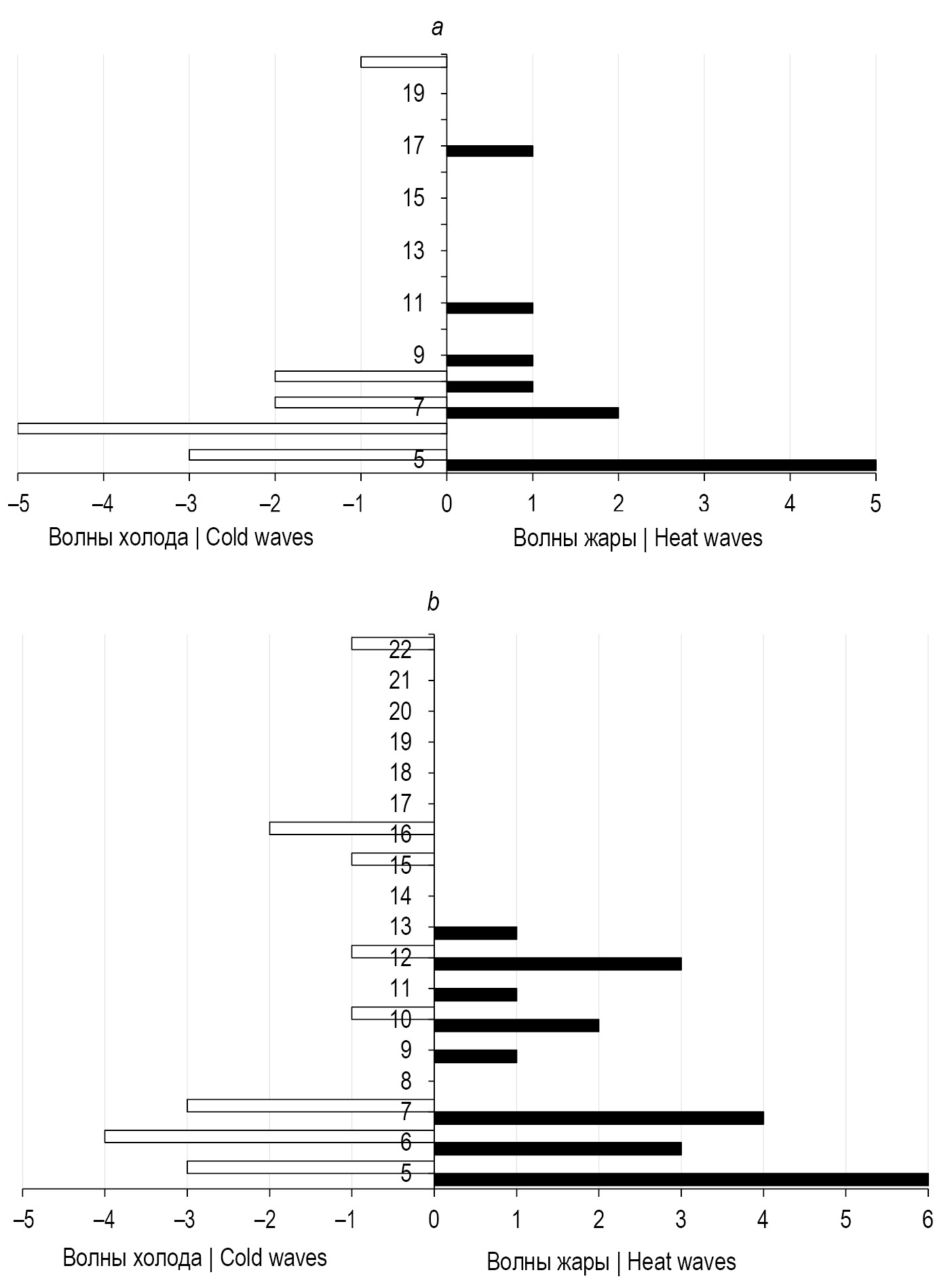 Note: Tav — the average air temperature during the wave period; аmplitude = Tav – TJuly for heat waves; Amplitude = Tav – TJanuary for cold waves.