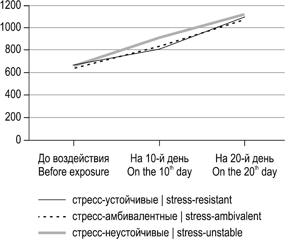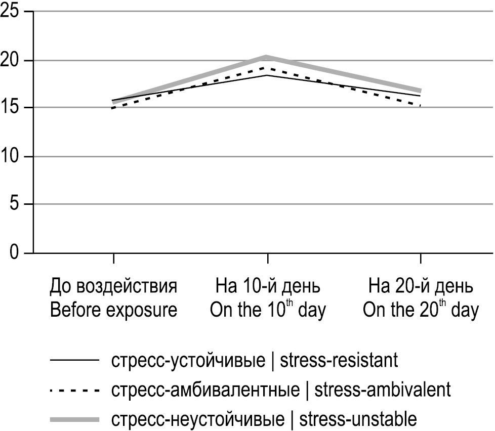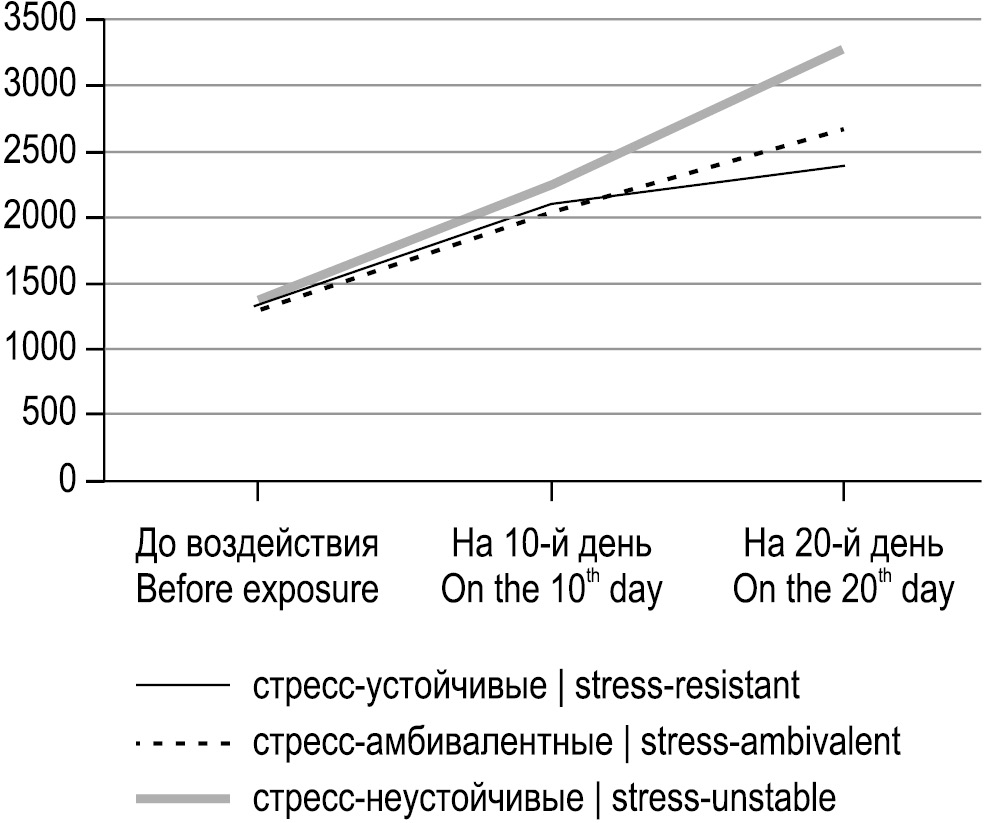 Как отмечал в своих работах H. Selye, факторы различной этиологии способны воздействовать на человека и вызывать сложный комплексный ответ организма в виде стресс-реакции и, как следствие, разбалансированность регуляторных физиологических систем [1, 2]. По современным представлениям, способность организма противостоять повреждениям в условиях стресса определяется продолжительностью и силой стрессорного стимула, особенностями стресс-лимитирующих и стресс-реализующих систем индивида. Известно, что в условиях стресса животные дифференцируются на устойчивых и подверженных различным нарушениям физиологических функций [3, 4].