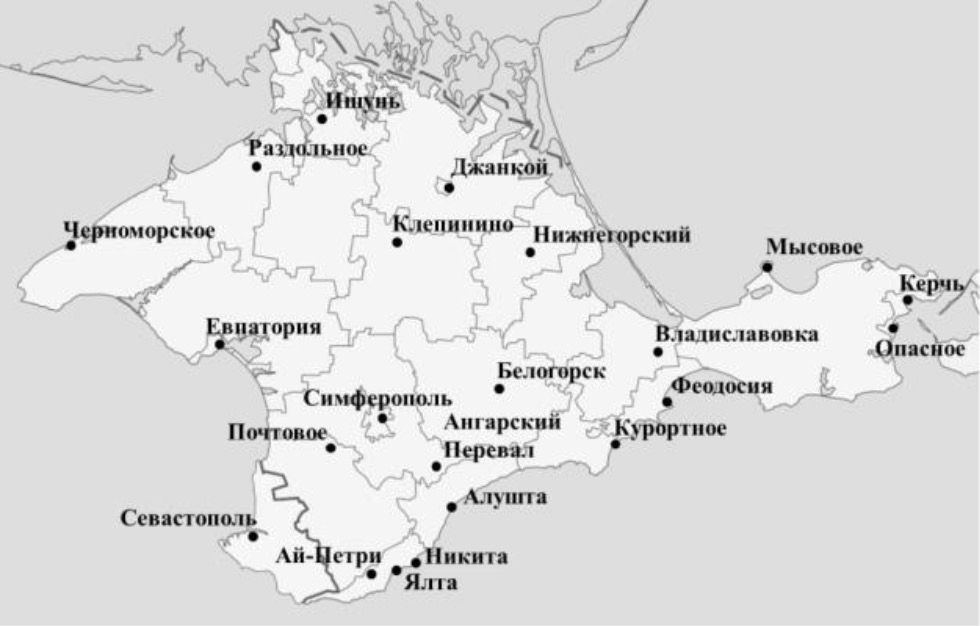 Для характеристики биоклиматических изменений на территории Крымского полуострова в работе оцениваются биоклиматические показатели в 22 точках расположения метеорологических станций. Учитывая, что в среднем пространственное распределение метеостанций в центральной Европейской части России составляет 1 станция на 4,6 тыс. км2 [18], репрезентативности имеющейся сети в Крыму достаточно для того, чтобы дать характеристику практически для всей территории полуострова, за исключением Главной гряды Крымских гор и внутренних районов Тарханкутского и Керченского полуостровов (рис. 1). При этом следует обратить внимание на то, что территория Крымского полуострова характеризуется наличием трёх основных типов климата: степной, горный и южнобережный. Климат степного, равнинного Крыма на его большей части (север, запад и центр полуострова) — континентальный, а в районах городов Евпатории, Феодосии и Керчи — степной приморский. Континентальность климата снижается в Крымских горах и предгорье. Самый мягкий климат, имеющий черты субтропического или субсредиземноморского — на южном побережье Крыма. Климат на большей части территории Севастополя также относится к субтропическому. Соответственно, районы расположения метеостанций на территории Крыма по своим климатическим условиям неоднородны, что объясняется влиянием Крымских гор и омывающих полуостров Черного и Азовского морей. Горы выступают барьером, задерживающим приходящий холодный континентальный и арктический воздух, а моря служат регулятором тепла, смягчая климат побережья.