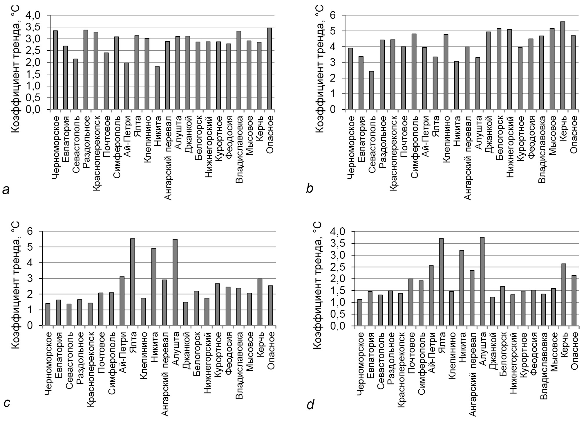 Коэффициент тренда (°С) — Trend coefficient (°С); Черноморское — Chernomorskoye; Евпатория — Yevpatoria; Севастополь — Sevastopol; Раздольное — Razdolnoye; Красноперекопск — Krasnoperekopsk; Почтовое — Pochtovoye; Симферополь — Simferopol; Ай-Петри — Ai-Petri; Ялта — Yalta; Клепинино — Klepinino; Никита — Nikita; Ангарский перевал — Angarsk Pass; Алушта — Alushta; Джанкой — Jankoy; Белогорск — Belogorsk; Нижнегорский — Nyzhnegorskiy; Курортное — Kurortnoye; Феодосия — Feodosia; Владиславовка — Vladislavovka; Мысовое — Mysovoye; Керчь — Kerch; Опасное — Opasnoye.