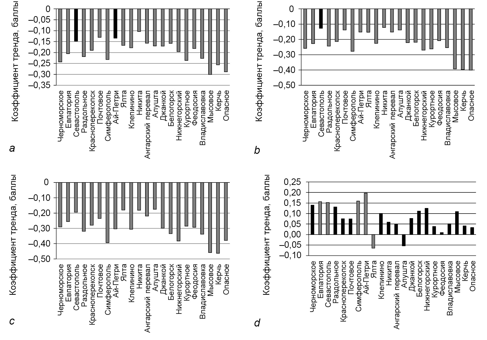 Повышение ЭТ в течение года сопровождается уменьшением значений индексов S и Hw. Оценка трендов значений индекса S подтвердила неравномерность проявления изменений в разные месяцы года. Наиболее чётко отрицательный линейный тренд выражен в марте (рис. 3) и составляет на разных станциях от –0,18 до –0,46 балла за 68 лет, причём это значимые на 99% уровне оценки. Максимальные значения отрицательных трендов в этом месяце относятся к приазовским местностям (Керчь, Мысовое, Опасное), а также к степной части Крыма (Симферополь и Нижнегорский). В январе и феврале для этих же станций характерны выраженные значимые отрицательные тренды со значениями от –0,20 до –0,46 балла за 68 лет. В декабре отрицательные тенденции сменяются на положительные почти на всех станциях (кроме Алушты и Ялты), но при этом значимые линейные тренды (выше 80%) выявлены для станций Ялта, Ай-Петри, Севастополь, Евпатория и Симферополь. Наибольший по величине положительный коэффициент тренда отмечается на станции Ай-Петри (0,20 балла за 68 лет), а отрицательный — в Ялте (–0,06 балла за 68 лет).