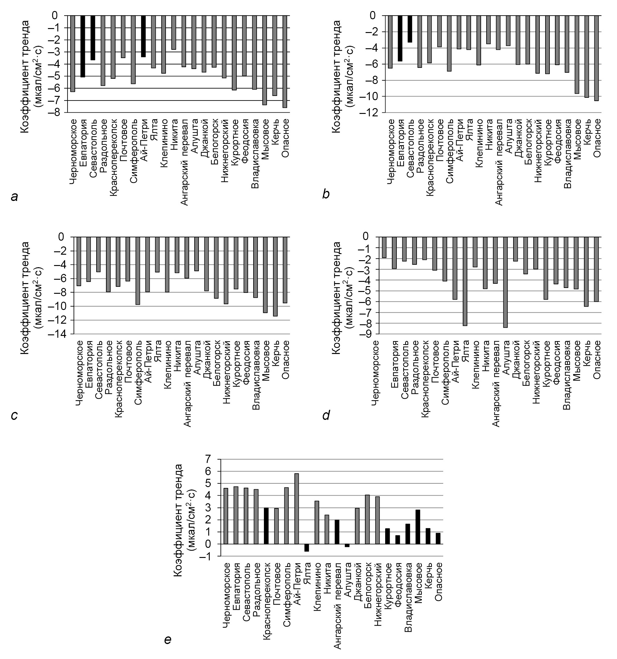 Коэффициент тренда (мкал/см2∙с) — Trend coefficient (mcal/cm2∙s); Черноморское — Chernomorskoye; Евпатория — Yevpatoria; Севастополь — Sevastopol; Раздольное — Razdolnoye; Красноперекопск — Krasnoperekopsk; Почтовое — Pochtovoye; Симферополь — Simferopol; Ай-Петри — Ai-Petri; Ялта — Yalta; Клепинино — Klepinino; Никита — Nikita; Ангарский перевал — Angarsk Pass; Алушта — Alushta; Джанкой — Jankoy; Белогорск — Belogorsk; Нижнегорский — Nyzhnegorskiy; Курортное — Kurortnoye; Феодосия — Feodosia; Владиславовка — Vladislavovka; Мысовое — Mysovoye; Керчь — Kerch; Опасное — Opasnoye.