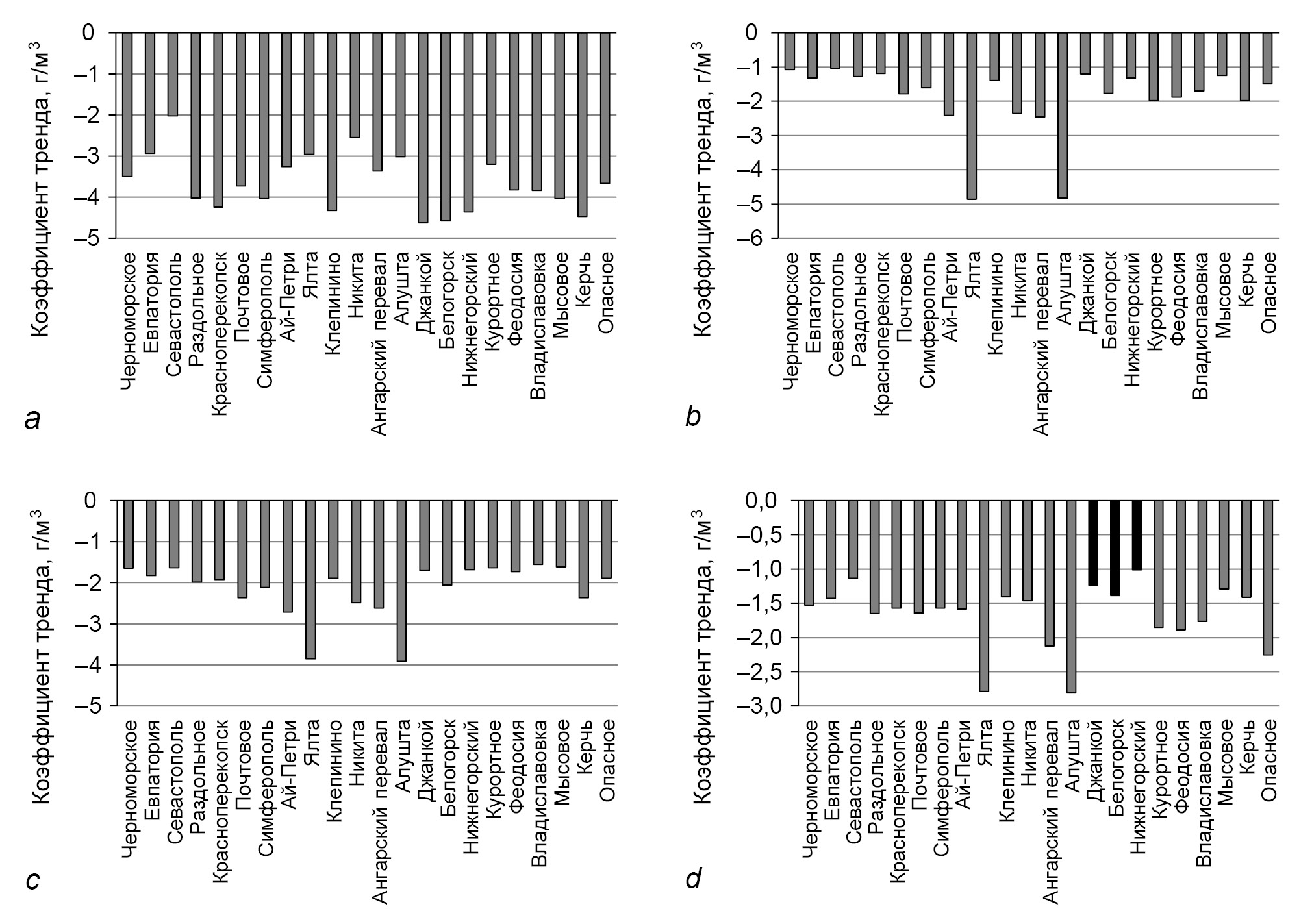 Коэффициент тренда (г/м3) — Trend coefficient (g/m3); Черноморское — Chernomorskoye; Евпатория — Yevpatoria; Севастополь — Sevastopol; Раздольное — Razdolnoye; Красноперекопск — Krasnoperekopsk; Почтовое — Pochtovoye; Симферополь — Simferopol; Ай-Петри — Ai-Petri; Ялта — Yalta; Клепинино — Klepinino; Никита — Nikita; Ангарский перевал — Angarsk Pass; Алушта — Alushta; Джанкой — Jankoy; Белогорск — Belogorsk; Нижнегорский — Nyzhnegorskiy; Курортное — Kurortnoye; Феодосия — Feodosia; Владиславовка — Vladislavovka; Мысовое — Mysovoye; Керчь — Kerch; Опасное — Opasnoye.