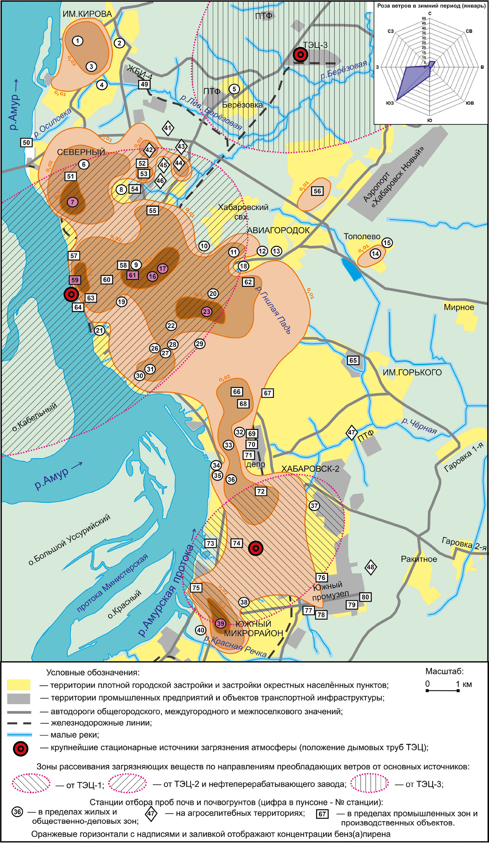 Город Хабаровск | 78 | 0,07955 | 38,8 | Наиболее загрязнёнными являются жилые зоны, расположенные по периметру производственных зон |