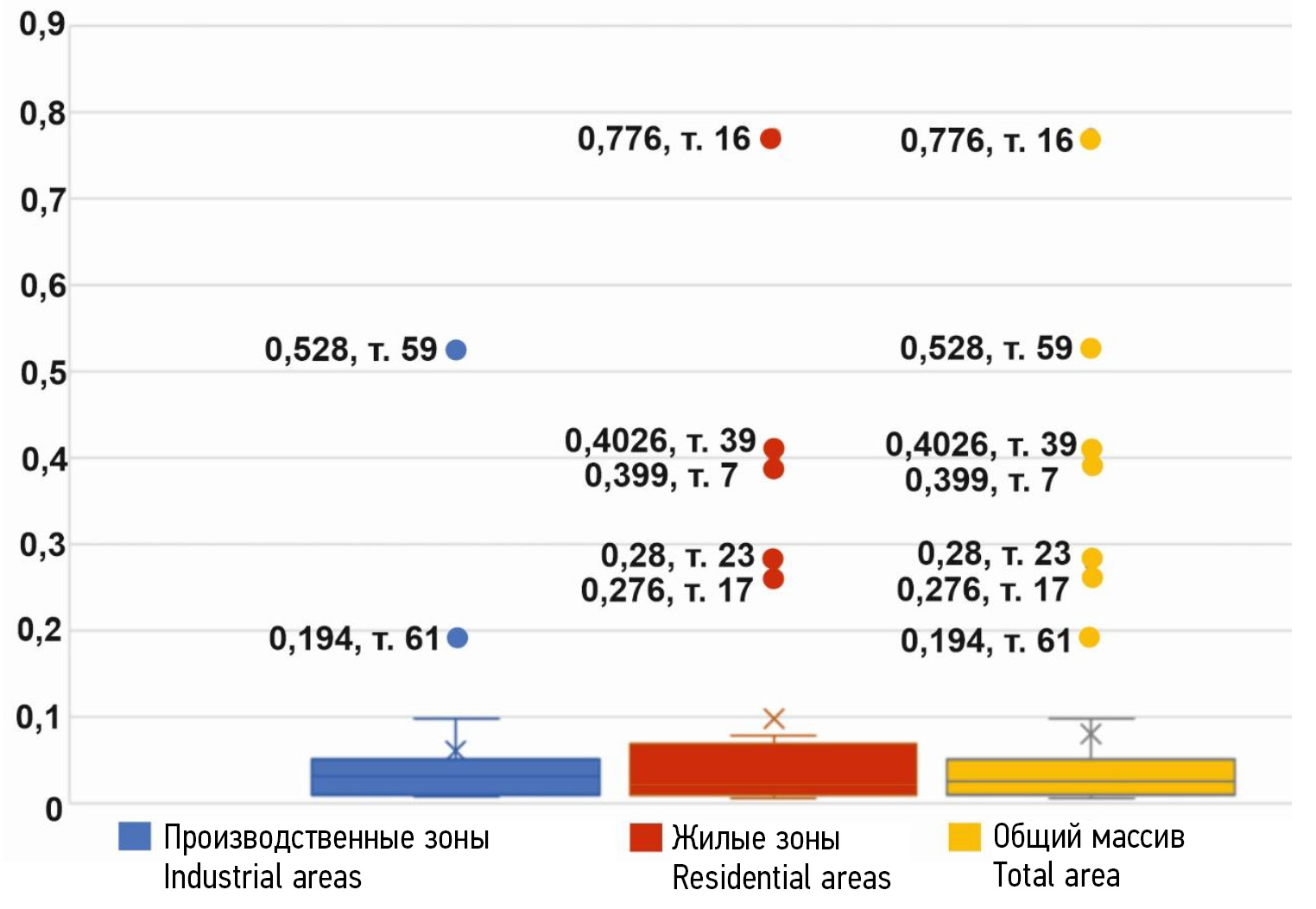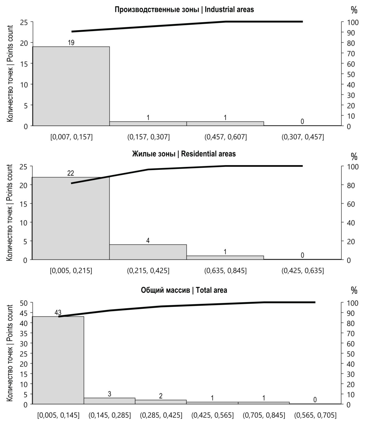 В общей выборке в 86% проб концентрация БП составляет 0,005–0,145 мг/кг, в жилых зонах 81,5% проб входят в интервал 0,005–0,215 мг/кг, в производственных зонах 90,5% проб вписываются в интервал 0,007–0,157 мг/кг (рис. 3).