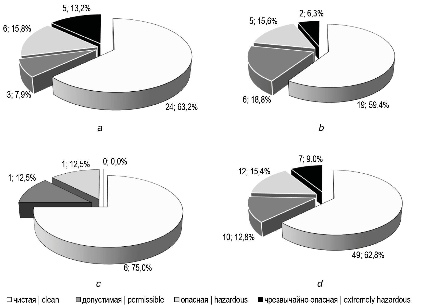 Рис. 4. Доля проб, процент по категориям загрязнения в разных функциональных зонах: а — жилые зоны, b —промышленные зоны, c — агроселитебные зоны, d — общая выборка. / Fig. 4. Percentage of samples, across pollution categories in different functional zones: a — residential zones, b — industrial zones, c — agro-residential zones, d — all zones.