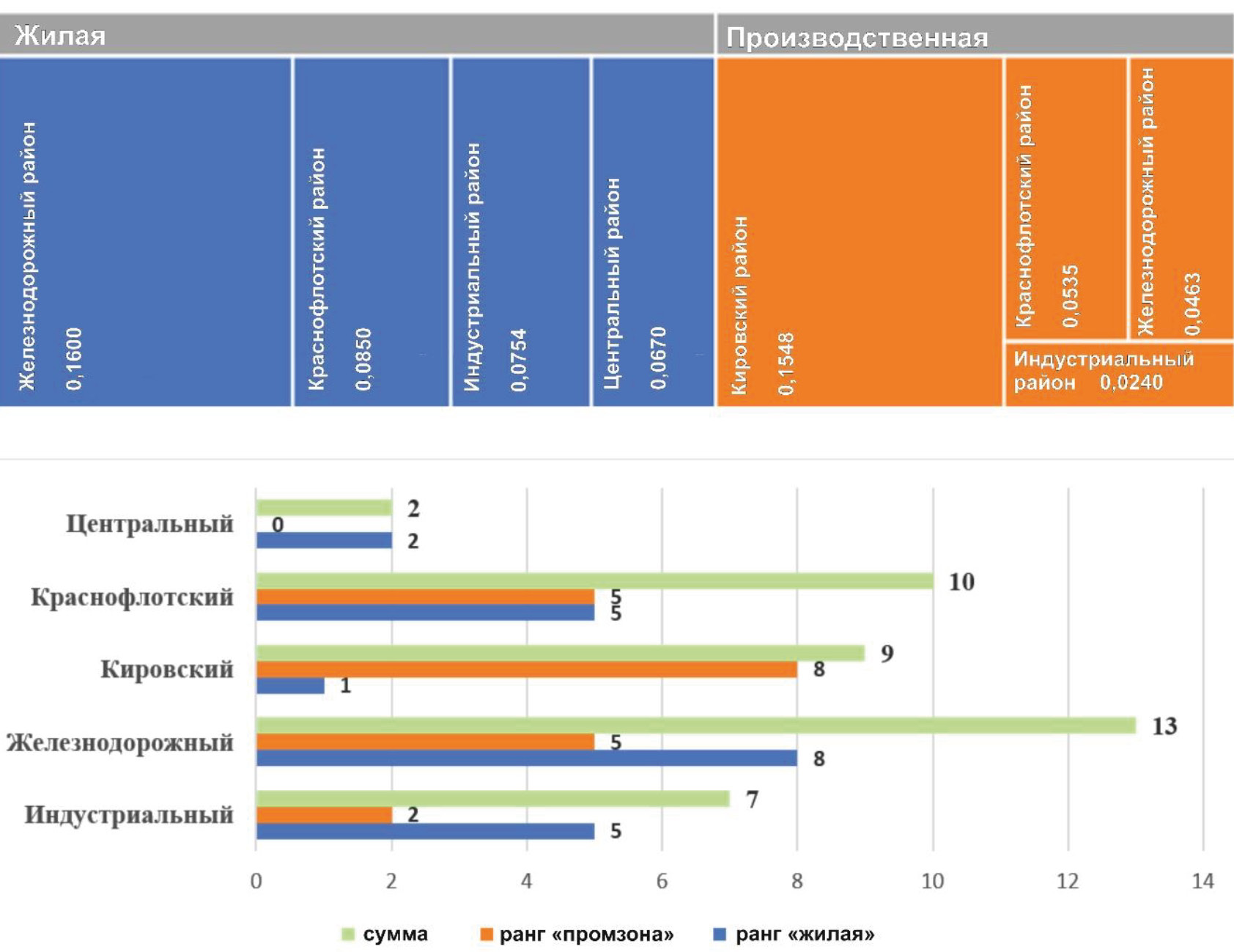 Анализ в разрезе административных районов города показал, что максимальные значения средних концентраций БП отмечены в почве жилых зон Железнодорожного района — 0,16 мг/кг (коэффициент опасности равен 8). По содержанию БП в почве производственных зон лидирует Кировский район — 0,1548 мг/кг, коэффициент опасности равен 7,74 (рис. 5). Ранжирование административных районов выполнено по среднему и максимальному содержанию БП в почве и сумме рангов раздельно по жилым и производственным зонам. Наиболее загрязнённым является Железнодорожный район. По загрязнению в промзоне лидирует Кировский район, в котором размещены Речной порт, ХНПЗ, ТЭЦ-2, бывший завод «Дальдизель».
