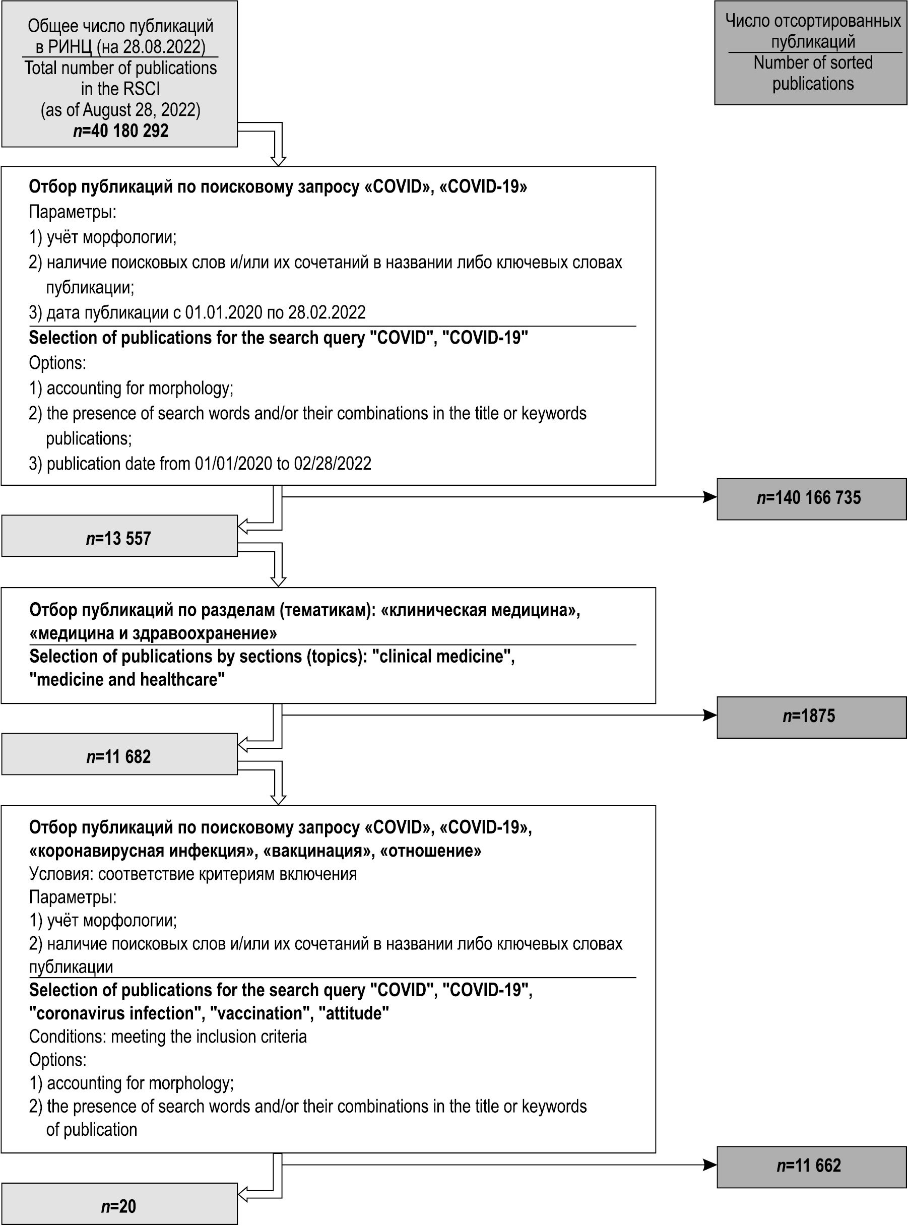 Этап 3. При дальнейшем поисковом запросе использовано сочетание слов «COVID», «коронавирусная инфекция», «вакцинация», «отношение», в результате получено 20 публикаций, соответствующих критериям включения [21–40].
