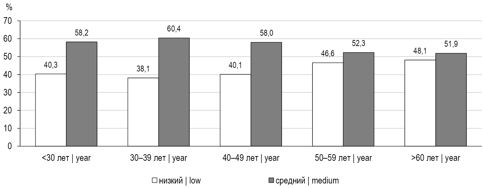 Рис. 1. Уровень презентеизма в разных возрастных группах, %. / Fig. 1. Presenteeism level in different age groups, %.