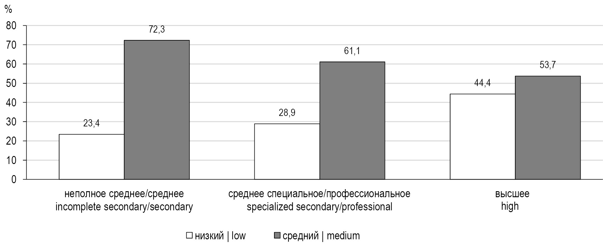 Рис. 2. Уровень презентеизма в зависимости от образования работников, %. / Fig. 2. Presenteeism level by employees’ education, %.
