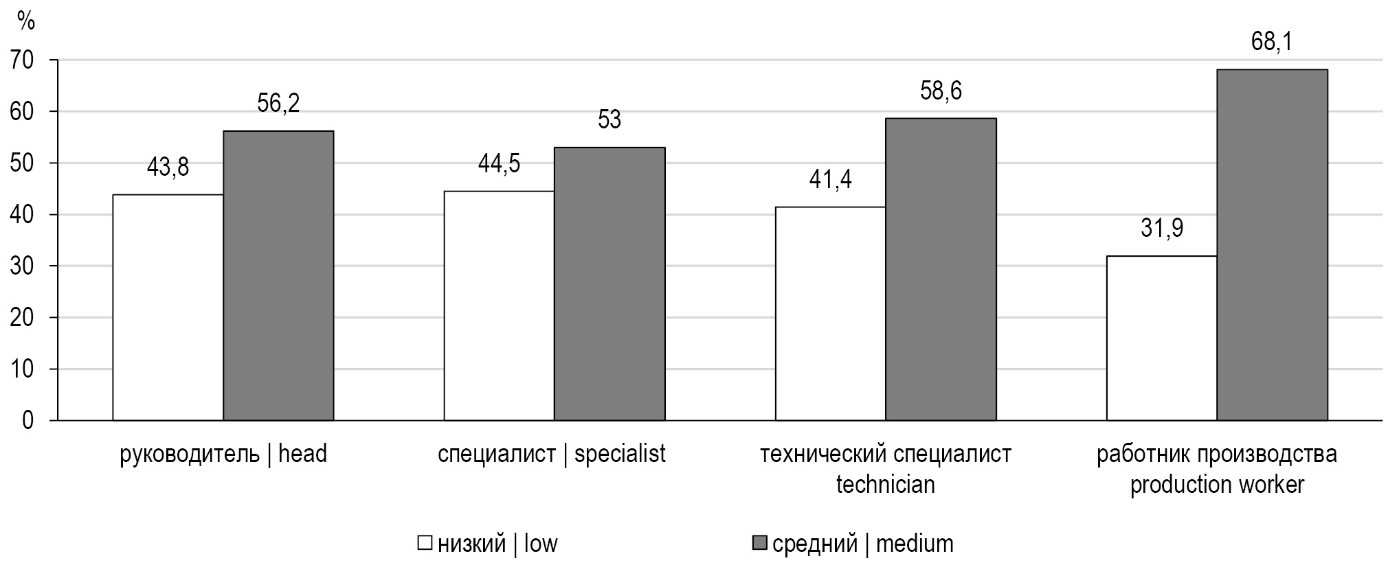 Рис. 3. Уровень презентеизма в зависимости от занимаемой должности, %. / Fig. 3. Presenteeism level by occupation, %.