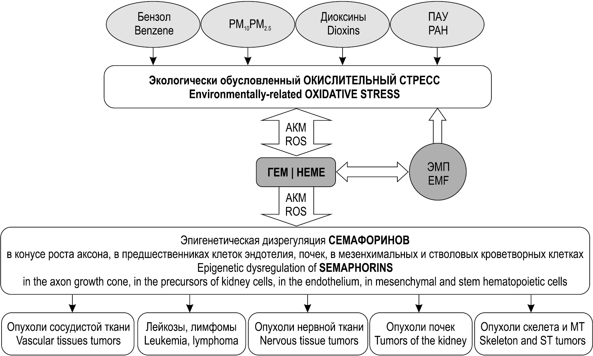 В настоящее время установлена важная роль экологически обусловленного окислительного стресса (EROS — от англ. environmentally related oxidative stress) в реализации канцерогенного потенциала факторов внешней среды [2, 8]. Способностью индуцировать EROS обладают самые различные факторы, в том числе бисфенол А, микрочастицы углерода PM2,5 и PM10, дым различной природы [5] и электромагнитные поля [5, 9]. Однако механизм индуцируемого EROS процесса онкогенеза остаётся неясным. Анализ литературных данных позволяет предложить гипотезу опухолевой трансформации под воздействием экологических факторов, в которой ключевую роль играет гем.