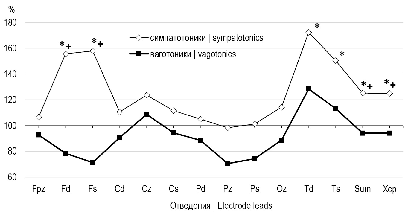 Significant differences between the groups of sympathotonics and vagotonics were found in the frontal areas in the right (Fd) and left (Fs) leads. Thus, sympathotonics demonstrated 49.6% and 54.9% (p=0.002; p=0.007, respectively) higher studied indicators compared with vagotonics.