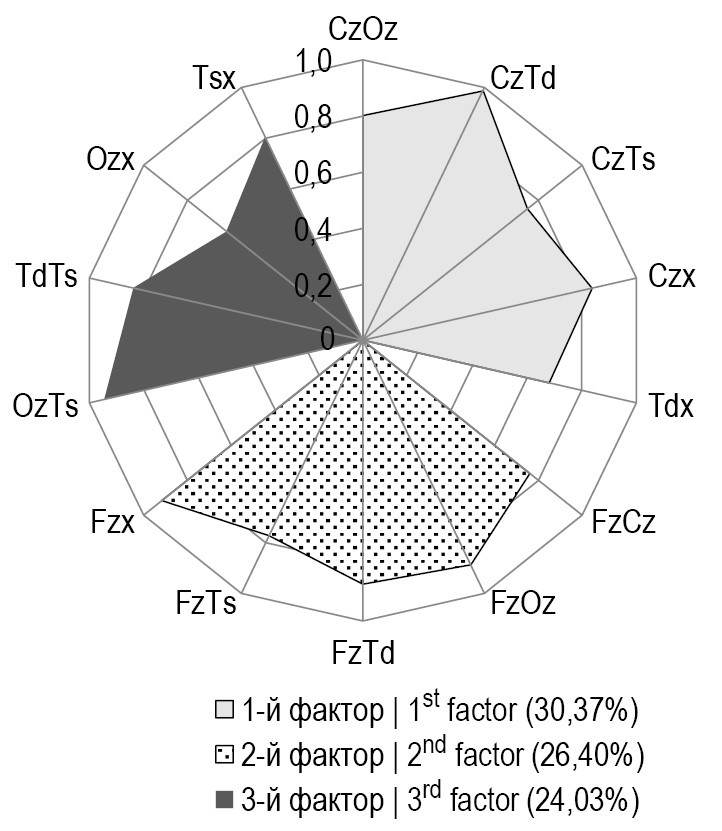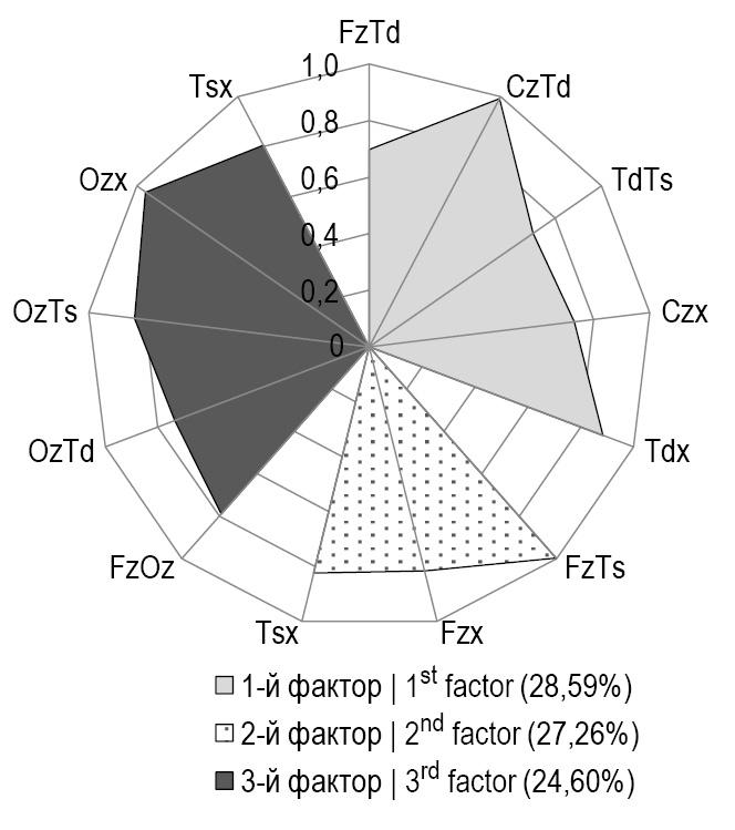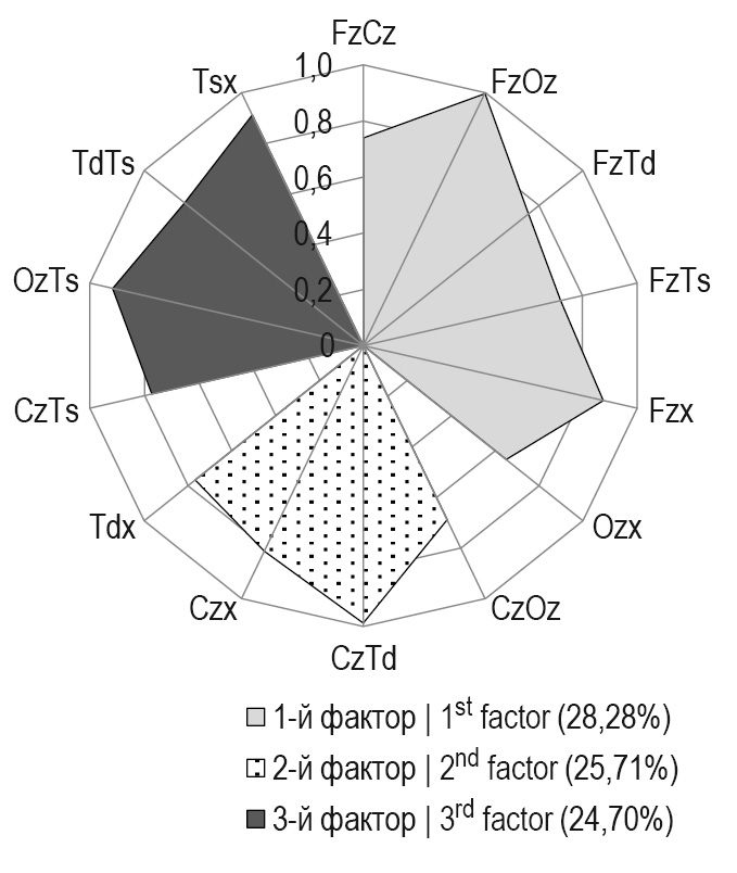 3 the factor of functional activity of temporal regions, accounting for 24.70% of the variance, combined the indicators Cz-Ts, Oz-Ts, Td-Ts, Ts- Csr, describing the activity of energy exchange mainly in the temporal and to a lesser extent in the central and occipital regions of the brain. The total variance was 78%.