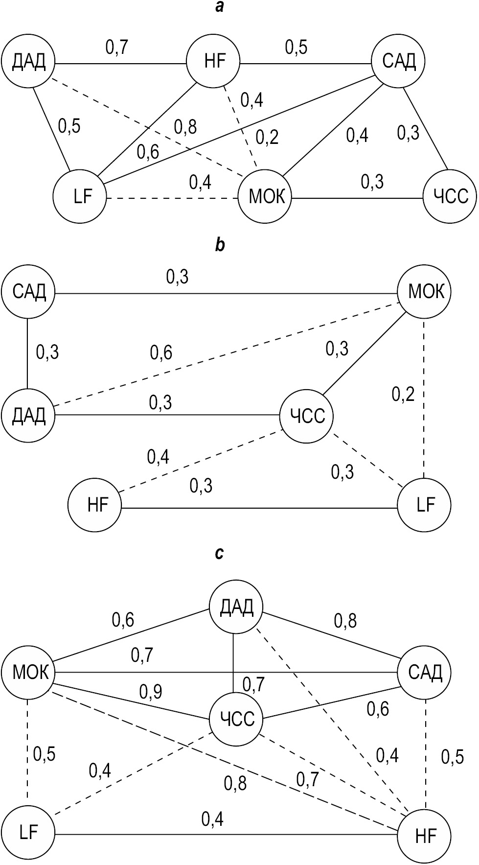 Рис. 1. Структуры корреляционных плеяд показателей гемодинамики и вариабельности ритма сердца уроженцев различных поколений: a — 0-е поколение, b — 1-е поколение, c — 3-е поколение. HF — мощность спектра высокочастотного компонента вариабельности сердечного ритма в диапазоне 0,40–0,15 Гц, LF — мощность спектра низкочастотного компонента вариабельности сердечного ритма в диапазоне 0,15–0,04 Гц, САД — систолическое артериальное давление, ДАД — диастолическое артериальное давление, ЧСС — частота сердечных сокращений, МОК — минутный объём кровообращения. / Fig. 1. Structures of correlation clusters of hemodynamic and heart rate variability indices in young men across generations generations: a — 0 generation, b — 1st generation, c — 3rd generation. HF — power of the high–frequency band (0.40–0.15 Hz), LF — power of the low-frequency band (0.15–0.04 Hz), САД — systolic blood pressure, ДАД — diastolic blood pressure, ЧСС — heart rate, МОК — cardiac output.