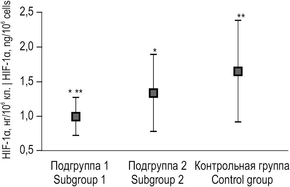 Рис. 1. Внутриклеточное содержание HIF-1α (нг/106 кл.) в подгруппах, различающихся по прошедшему после инфекции COVID-19 времени, и группе контроля; M±SD: * различия статистически значимы между подгруппой 1 и подгруппой 2; ** различия статистически значимы между подгруппой 1 и контрольной группой. / Fig. 1. Intracellular concentration of HIF-1α (ng/106 cells) across subgroups by the time elapsed after COVID-19 infection and in the control group (M±SD): * differences are statistically significant between subgroup 1 and subgroup 2; ** differences are statistically significant between subgroup 1 and control group.