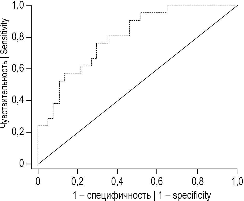 Информативность HIF-1α в качестве классификатора для определения наличия или отсутствия отложенного влияния инфекции COVID-19 на метаболизм лимфоцитов периферической крови была оценена при помощи ROC-анализа. Предполагалось, что статистическая значимость прогноза увеличивается с уменьшением значения классификатора. Построенная ROC-кривая (рис. 2) имела следующие характеристики: площадь под кривой AUC=0,81, 95% доверительный интервал: 0,70–0,92, р <0,0001. Значение AUC, лежащее в пределах 0,8–0,9, характеризует качество модели как очень хорошее согласно экспертной шкале оценки [11], следовательно, можно говорить о высокой прогностической силе модели. Оптимальным порогом отсечения было выбрано значение 1,25, для которого чувствительность и специфичность составили 76,2 и 70,3% соответственно. Полученный результат позволяет предполагать, что при внутриклеточном уровне HIF-1α ниже порогового значения (1,25 нг/106 кл.) вероятность наличия изменений метаболизма лимфоцитов после инфекции COVID-19 достаточно высока.