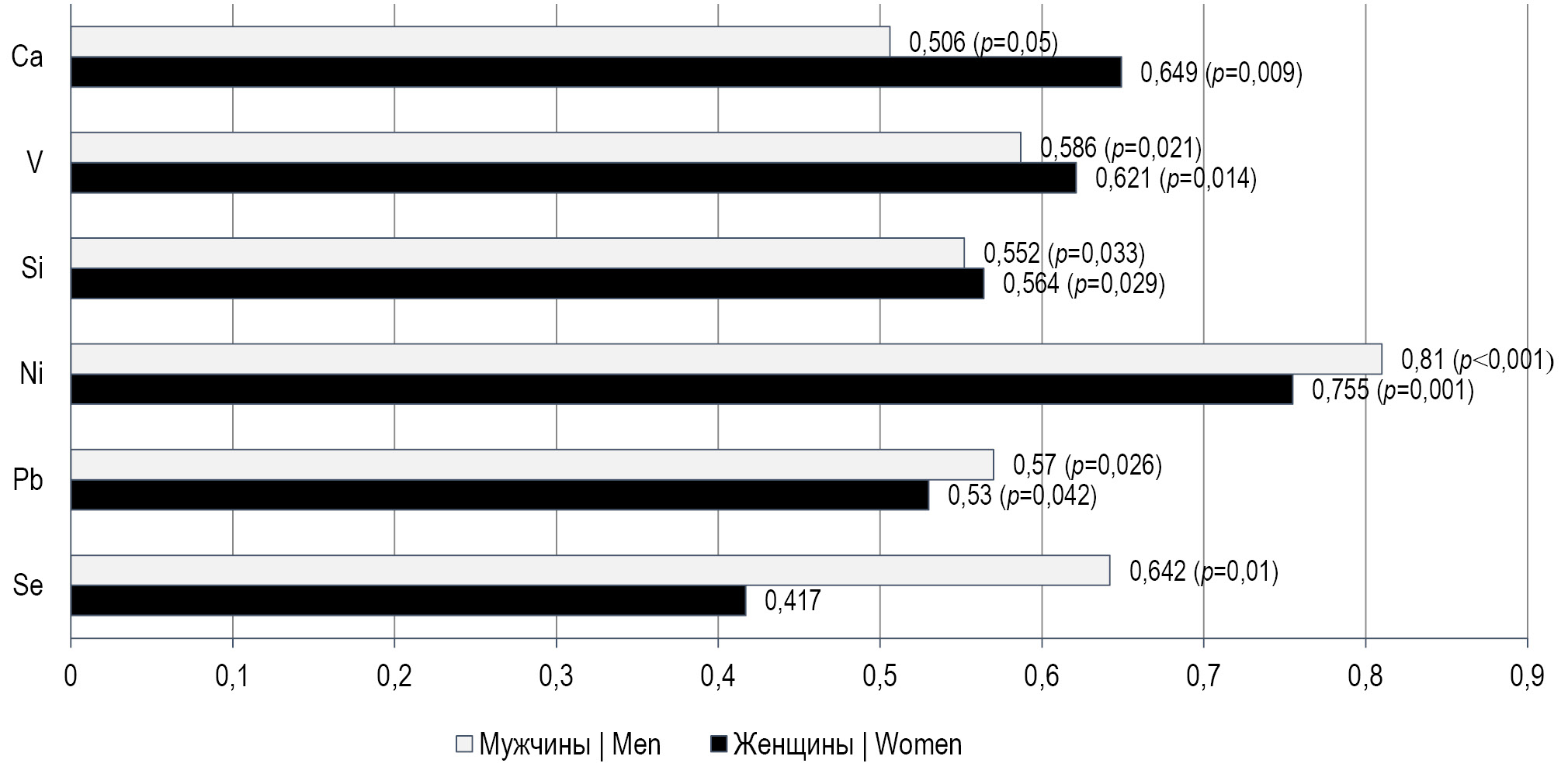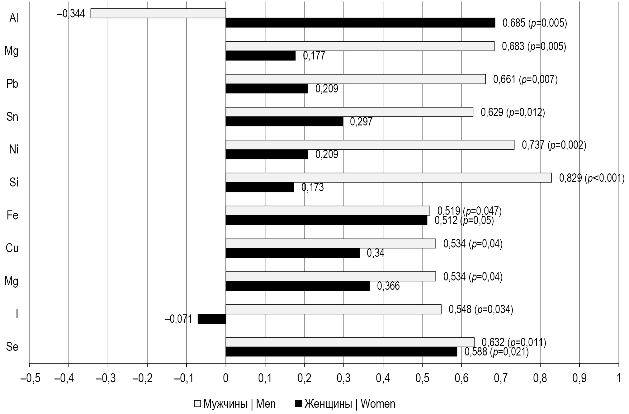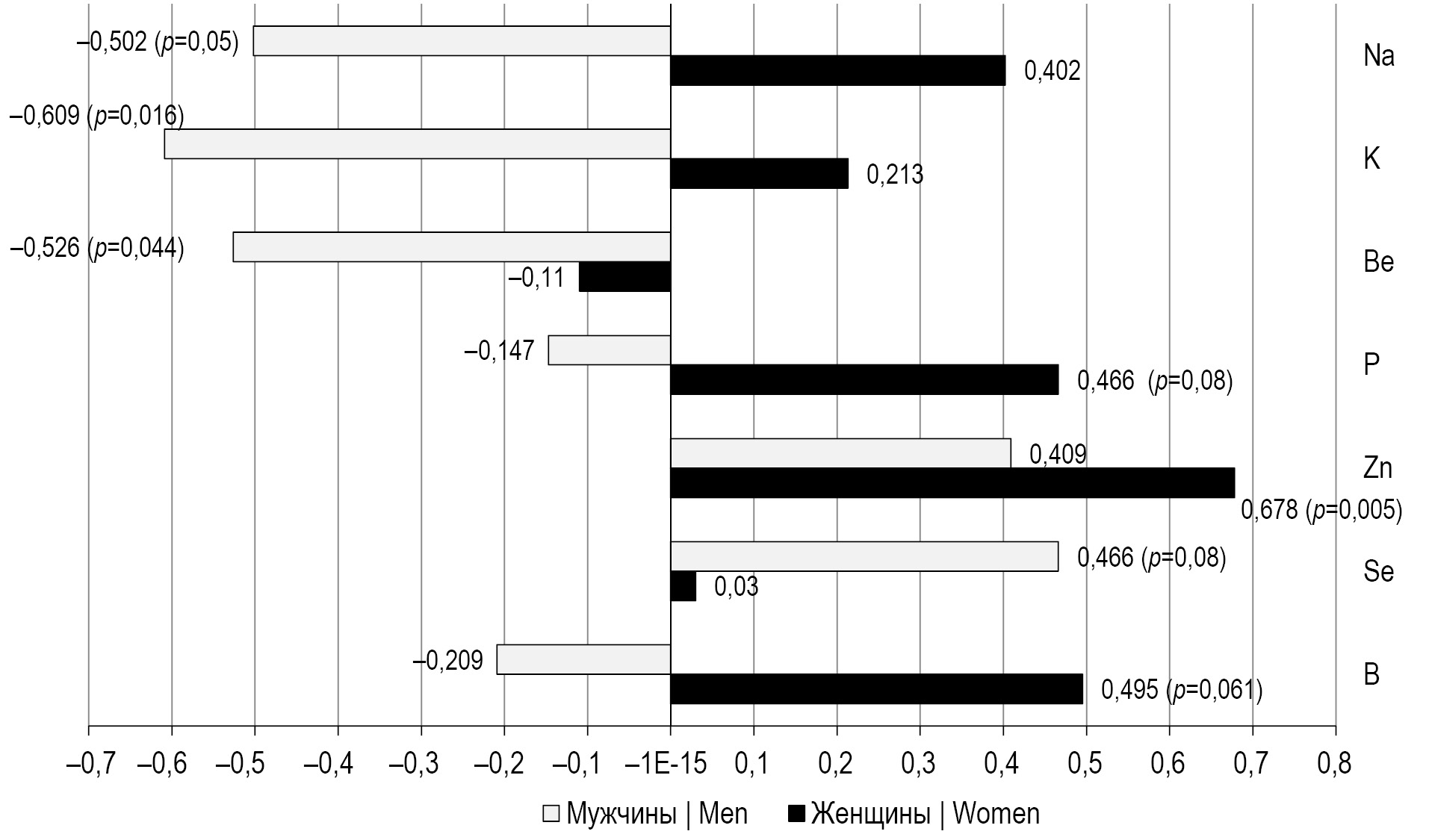 Анализ связей показателей склонности человека к девиантным формам поведения с уровнем содержания 25 химических элементов выявил ряд значимых результатов. По показателям риска совершения насильственных преступлений агрессивность спонтанная статистически значимо отрицательно коррелирует только в группе женщин с содержанием в организме мышьяка (r=–0,598, р=0,019) и кадмия (r=–0,521, р=0,046). В то же время агрессивность реактивная характеризуется статистически значимой связью и тенденцией к статистически значимой связи (р < 0,1) с содержанием нескольких микро- и макроэлементов как у мужчин, так и у женщин (рис. 1).