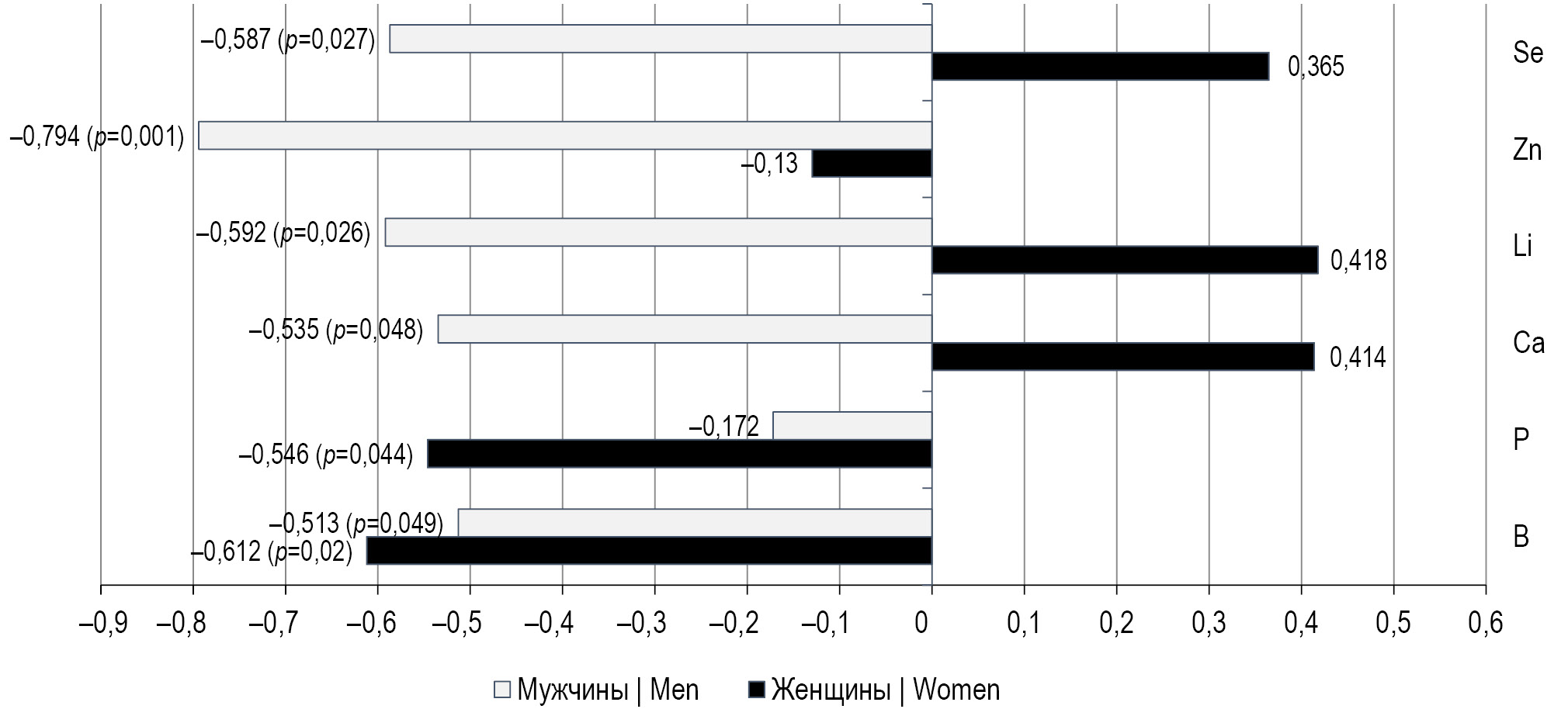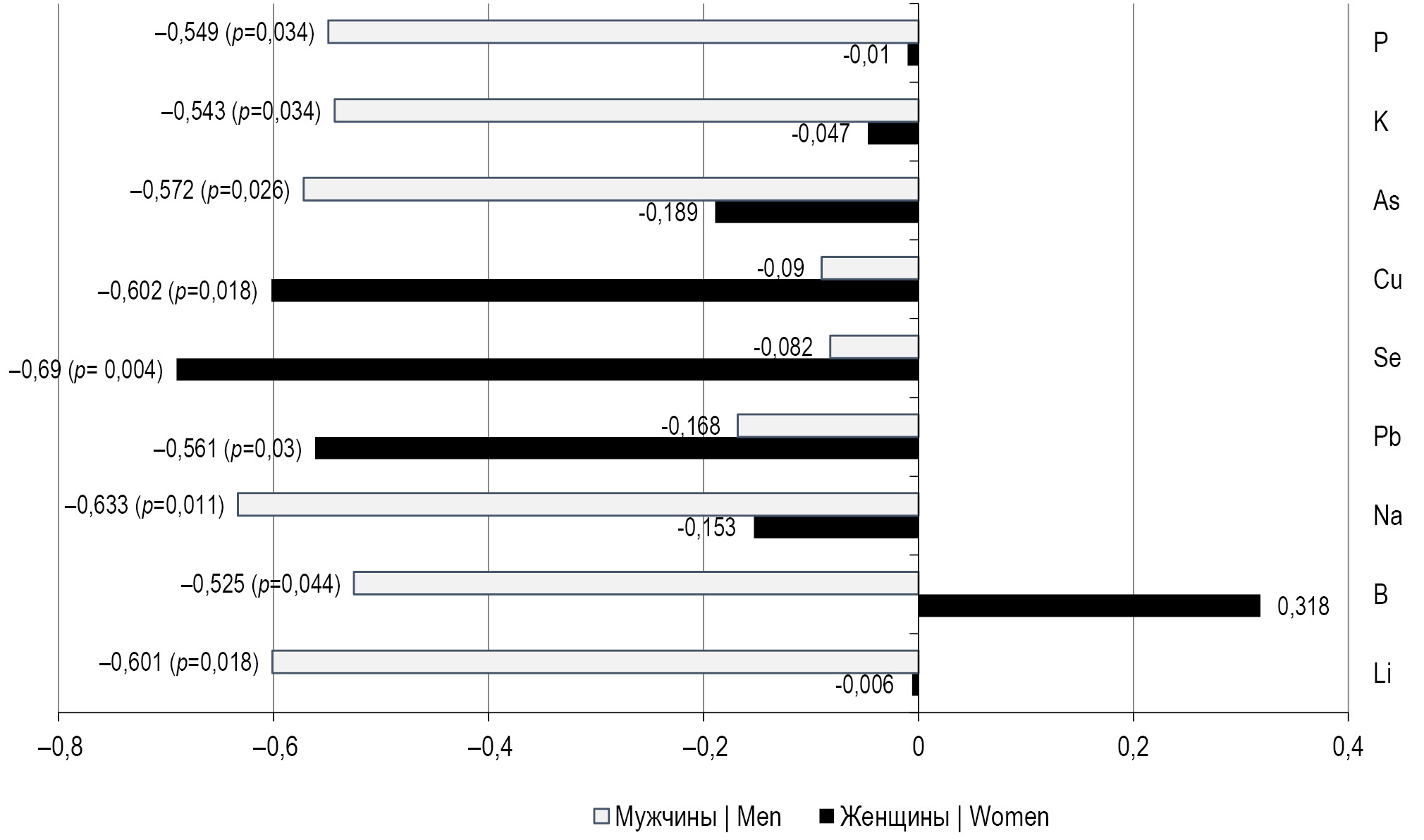 Fig. 2. Correlations between the level of depression and concentrations of chemical elements in men and women. Note: P — phosphorus, K — potassium, As — arsenic, Cu — copper, Se — selenium, Pb — lead, Na — sodium, B — boron, Li — lithium.
