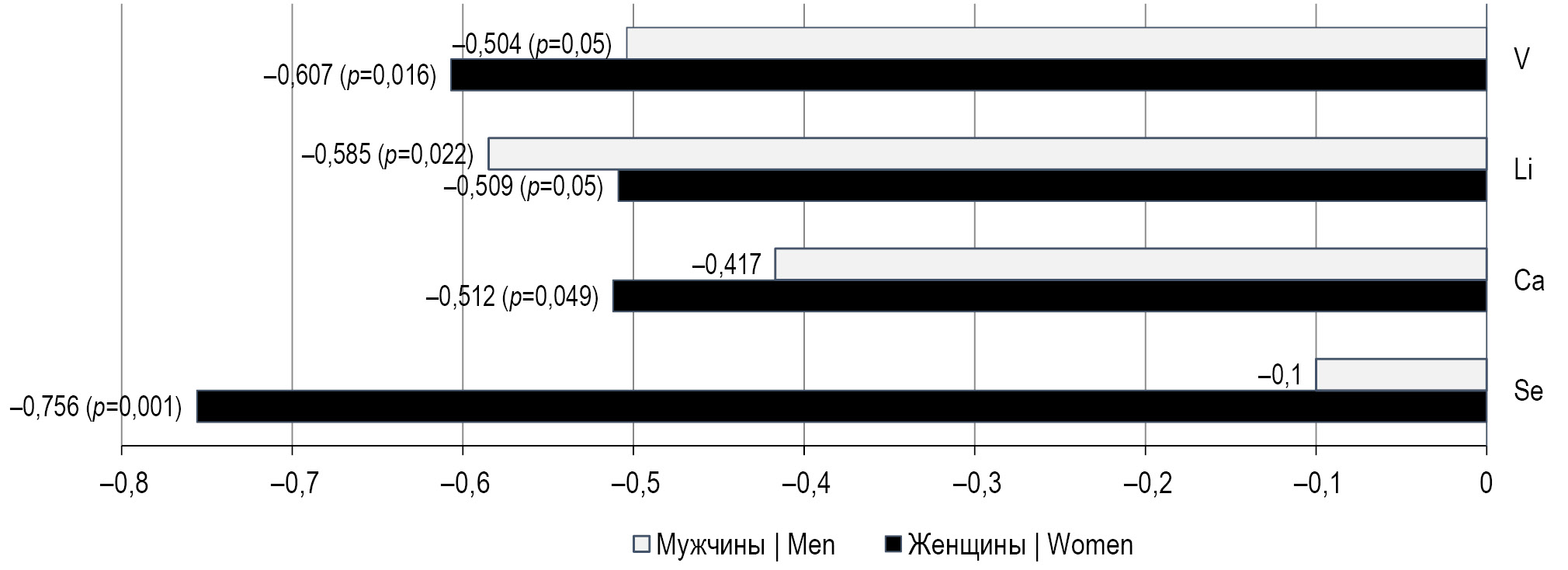 В отношении риска аутоагрессивного поведения оба анализируемых показателя (депрессивность и уровень суицидальных идеаций) за единичным исключением демонстрируют выраженную обратную связь с содержанием биологически значимых химических элементов. При этом в группе мужчин статистически значимая связь дефицита лития сопряжена как с депрессивностью, так и с суицидальными идеациями, а в группе женщин аналогичная комплексная связь показателей аутоагрессивного поведения проявляется с дефицитом селена. Как известно, литий и селен в нормальных концентрациях способствуют формированию положительных психических состояний человека, однако в данном случае выявлена существенная специфика проявления дефицита этих элементов у мужчин и у женщин, связанная с риском суицида.