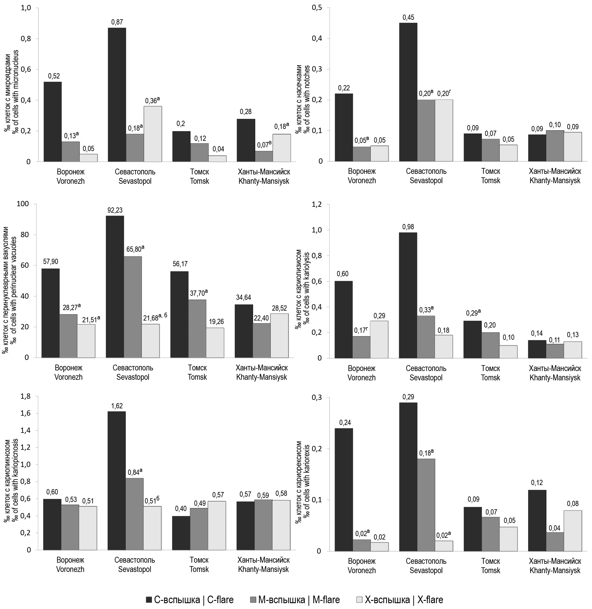 Выявлены совместные эффекты исследуемых факторов на стабильность генетического аппарата испытуемых. Показано влияние вида (силы) вспышки и сезона её возникновения (С-вспышка — зима, М-вспышка — весна, Х-вспышка — осень) на количество клеток с микроядрами, перинуклеарными вакуолями, насечками, протрузиями типа «разбитое яйцо» и «язык», кариорексисом, кариолизисом, кариопикнозом. Данный факт может указывать на то, что цитогенетический эффект обусловлен не самой вспышкой на Солнце, а силой вспышки или сезоном года, в который она произошла (см. табл. 1–3). Диаграммы, построенные на основании полученных данных, демонстрируют общую тенденцию к снижению количества клеток с аномалиями от С- к Х-вспышке, что можно объяснить влиянием сезона года. Наибольшее количество нарушений наблюдалось у испытуемых, проживающих в Севастополе и Воронеже, наименьшее — в Томске и Ханты-Мансийске (рис. 1, 2).