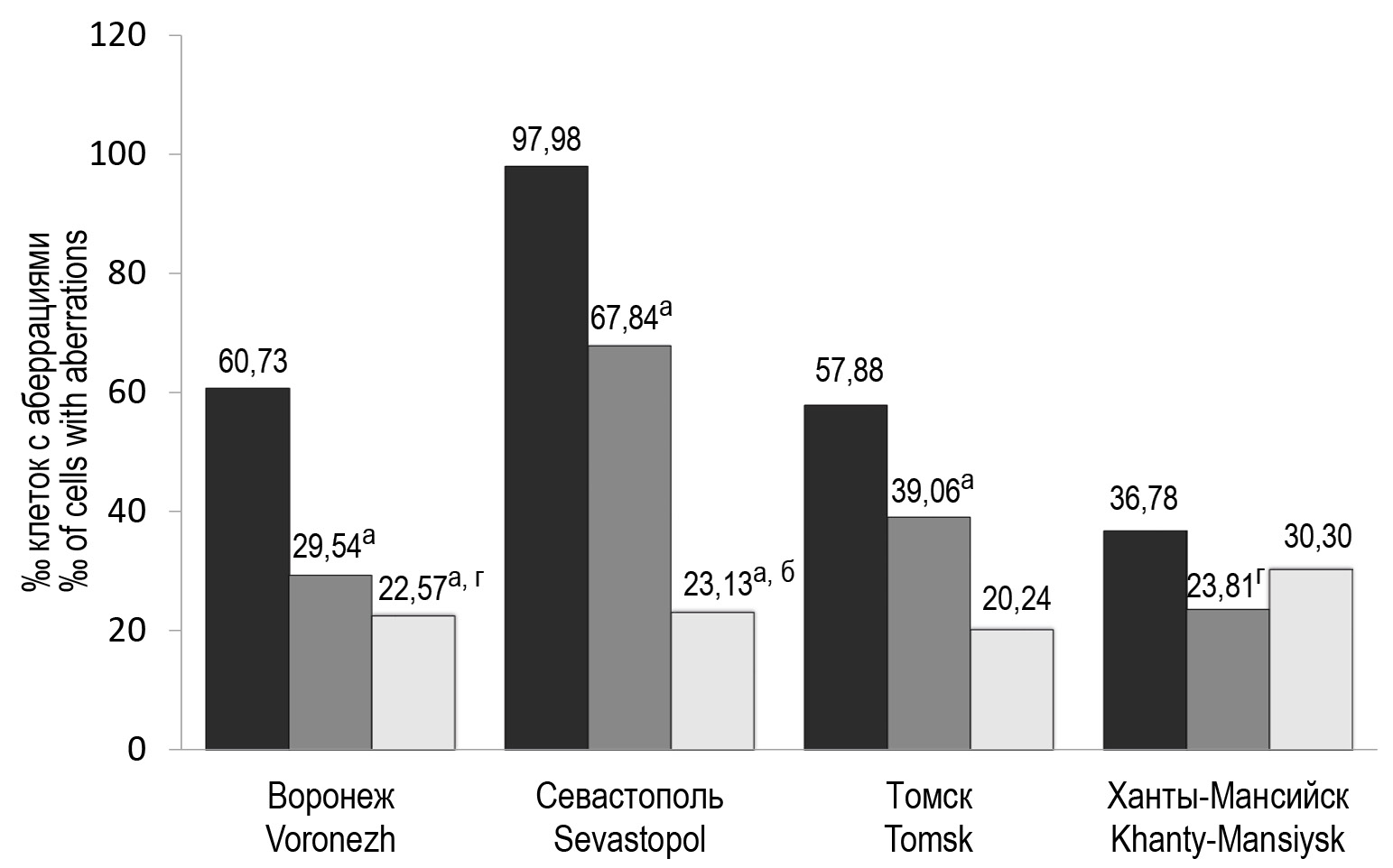 Fig. 1. Frequency of cells with nucleus abnormalities in buccal epitheliocytes of the subjects (‰) depending on the city of residence and season of the year. Designations: a — the difference with the frequency of occurrence of cells with abnormalities occurring in the C-flare is significant (р <0.001); б — the difference with the frequency of cells with abnormalities occurring in the M-flare is significant (р <0.001); в — the difference with the frequency of cells with abnormalities occurring at C-flare is significant (р <0.01); г — the difference with the frequency of cells with abnormalities occurring at C-flare is significant (р <0.05).