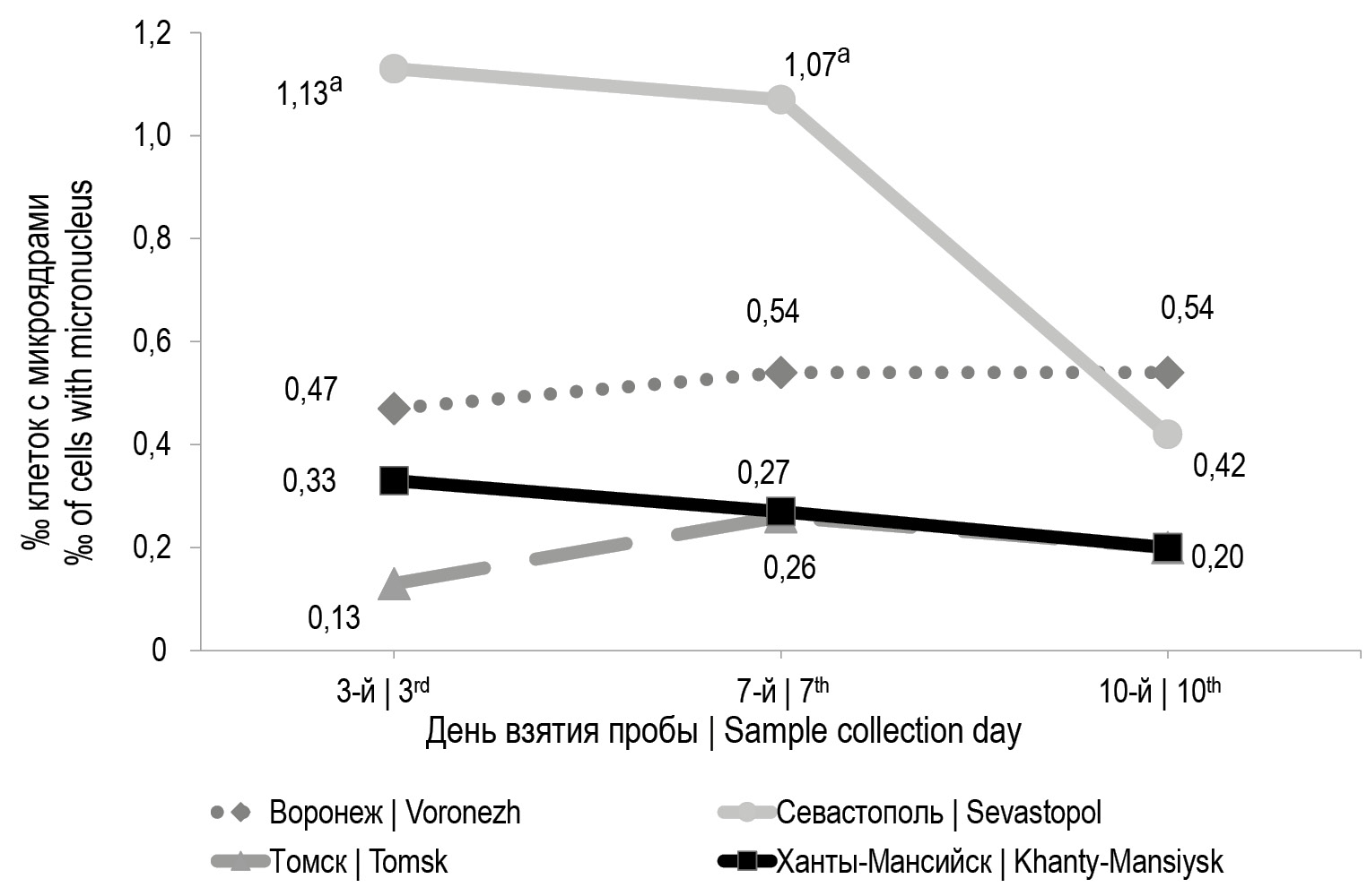 Fig. 3. Associations between the number of cells with micronuclei (‰) and the day of sampling in the C-flare. Notations: a — the difference with the frequency of cells with abnormalities 10 days after exposure to the flare is significant (р <0.05).
