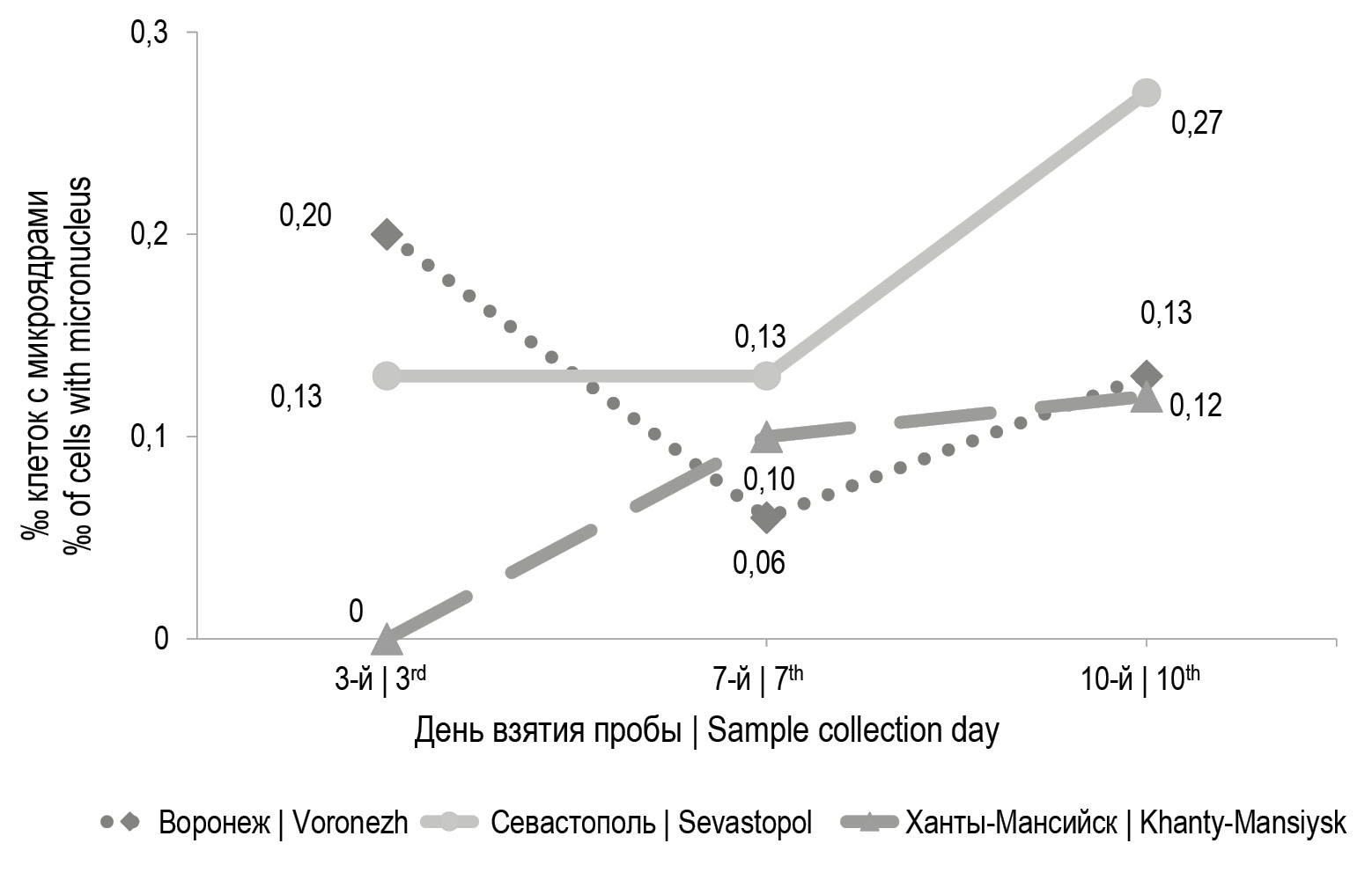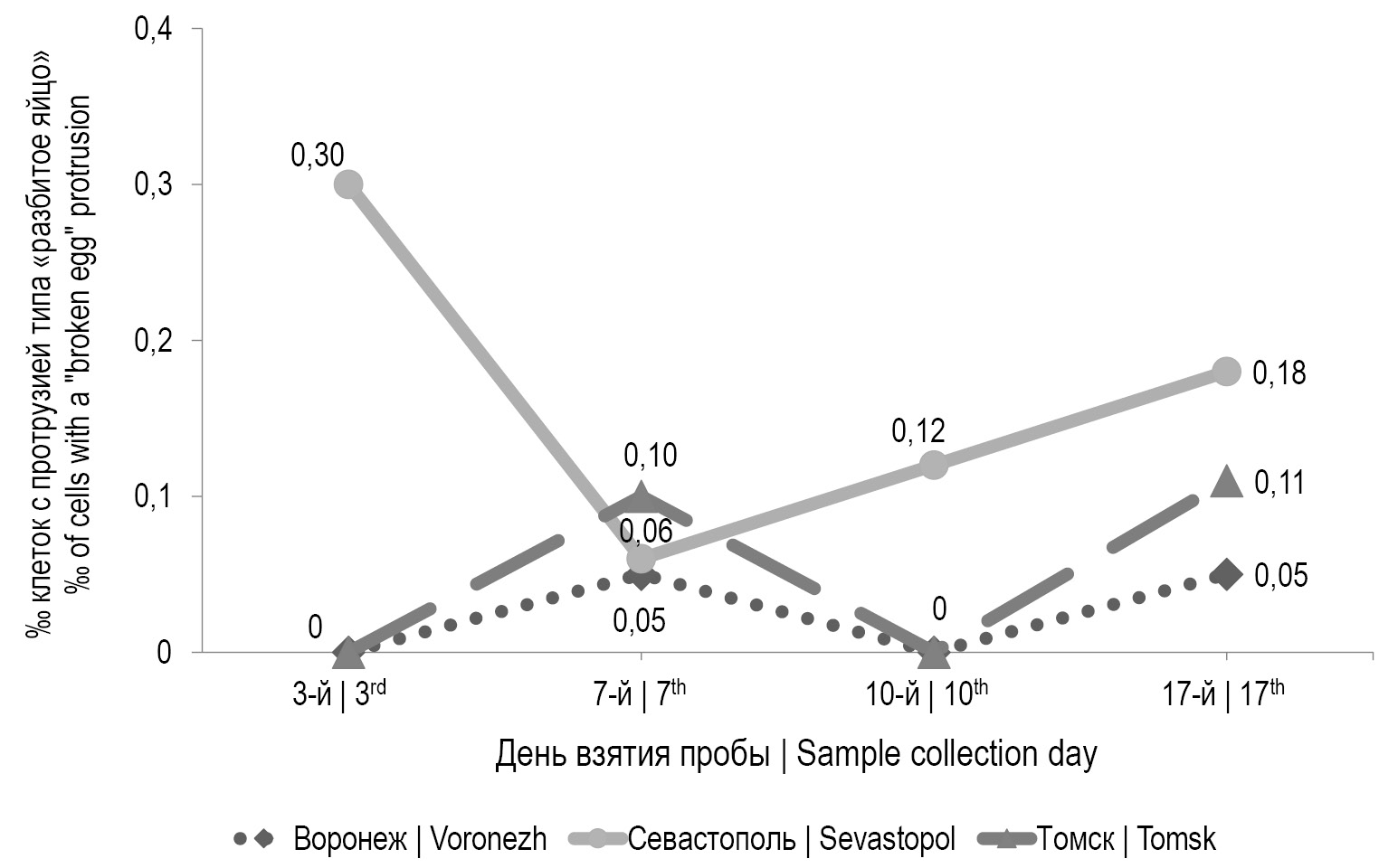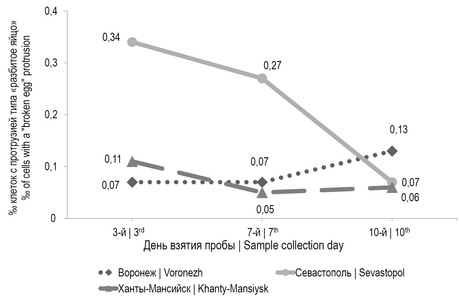 По результатам нашего исследования наибольшее количество клеток с нарушениями ядра отмечается у мужчин, проживающих в Севастополе, что связано с наиболее высоким антропогенным загрязнением данного города по сравнению с остальными городами. Это подтверждает ряд ранее проведённых исследований, указывающих на то, что антропогенное загрязнение воздействует на генетическую стабильность соматических клеток человека [11, 12].