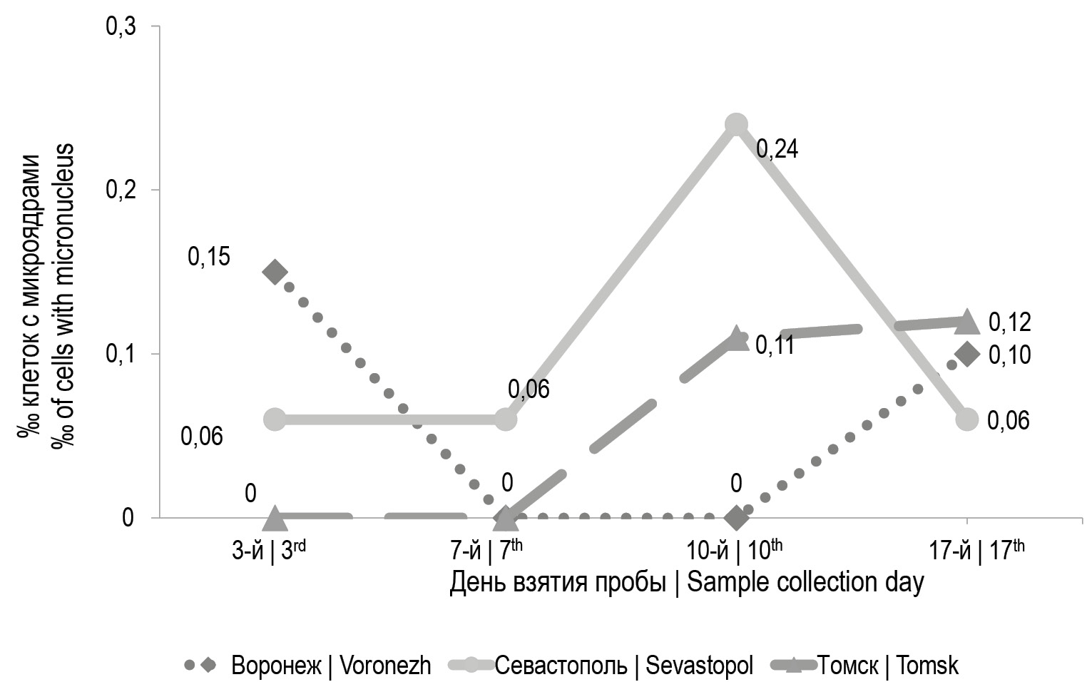 Сбор материала для цитогенетического исследования осуществляли на 3-, 7- и 10-й день после солнечной вспышки. 10 сентября 2017 г. произошла ещё одна Х-вспышка мощностью около 1·10–3 Вт/м2, поэтому материал был собран также на 17-й день после вспышки. Проанализированы образцы из Воронежа, Севастополя и Томска. Сбор образцов в данные периоды времени обусловлен тем, что слизистая оболочка внутренней стороны щеки человека представлена многослойным плоским неороговевающим эпителием, который обновляется за счёт деления базального слоя. Клетки базального слоя выходят в поверхностные слои только через 3–7 сут и могут быть использованы для микроядерного анализа [9]. Стоит также учитывать, что после вспышки поток ионизированных частиц — солнечный ветер — достигает Земли через 2–3 сут [2]. Таким образом, результаты, полученные при анализе материалов, собранных на 7-й день после вспышки, должны отражать влияние солнечной активности на генетическую стабильность соматических клеток человека.
