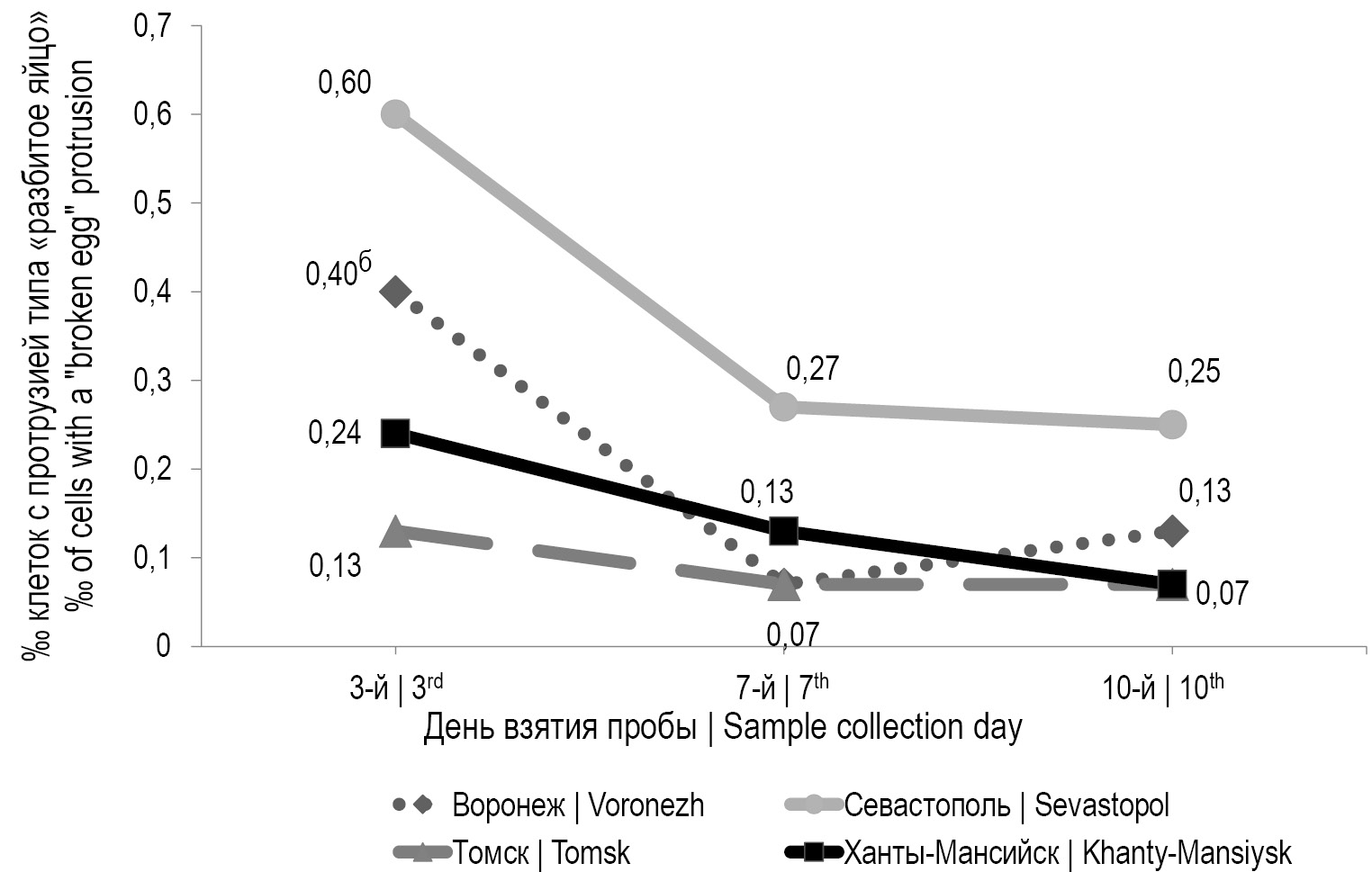 Fig. 6. Associations between the number of cells with “broken egg” type protrusions (‰) and the day of sampling in the C-flare. Notations: б — the difference with the frequency of cells with abnormalities 7 days after exposure to the flare is significant (р <0.05).