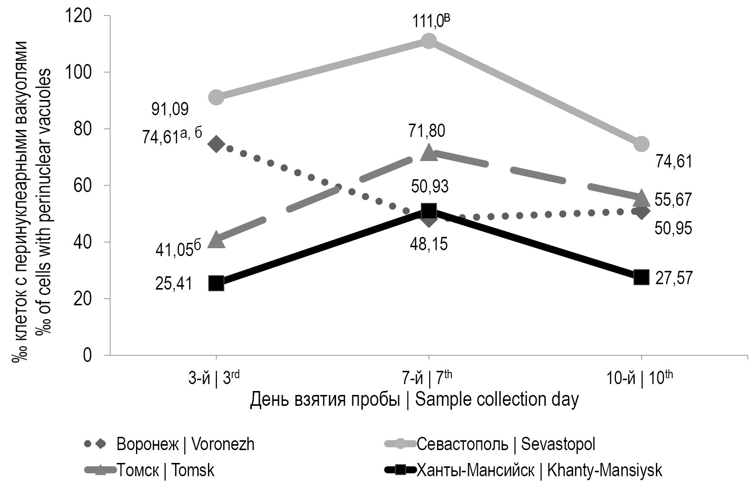 Fig. 9. Associations between the number of cells with perinuclear vacuoles (‰) and the day of sampling in the C-flare. Notations: a — the difference with the frequency of cells with abnormalities 10 days after exposure to the flare is significant (р <0.05); б — the difference with the frequency of cells with disorders 7 days after exposure to the flare is significant (р <0.05); в — the difference with the frequency of cells with