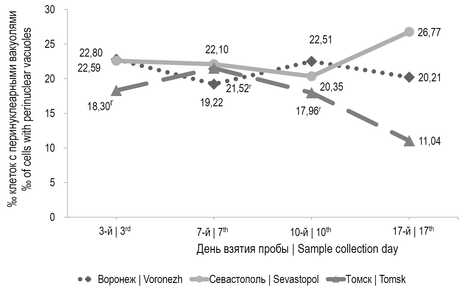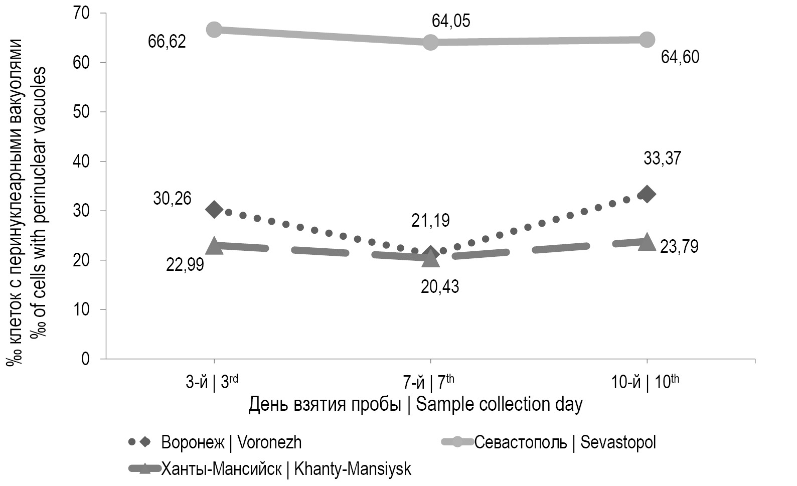 Показано также одновременное воздействие сезона и дня взятия пробы на такие ядерные аномалии, как перинуклеарные вакуоли, протрузии типа «разбитое яйцо» и общее количество аберраций ядра (см. табл. 1–3).