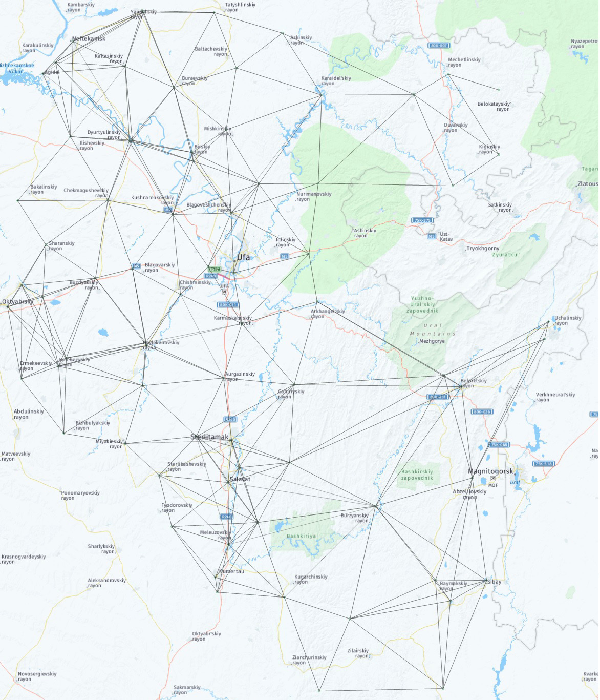 Для учёта пространственных связей сформирована весовая матрица смежности wij по принципу бинарного ответа: 1 присваивалась ячейке матрицы, если между i-м и j-м муниципалитетами есть общая граница, 0 — если общей границы нет. Причём для городских округов определяли в ячейках матрицы 1 как на пересечении с муниципалитетом, в котором находится данный город, так и на пересечении с муниципалитетами, которые граничат с данным муниципальным образованием, т.е. для каждого города учитывали соседство с районами его агломерации. Визуализация матрицы смежности представлена на рис. 1 в виде графа, построенного по центрам рассматриваемых районов и городских поселений.