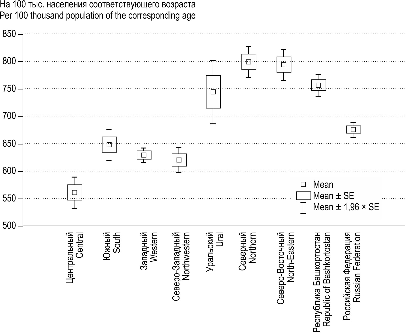 Рис. 2. Уровень общей смертности населения трудоспособного возраста в регионах Республики Башкортостан (оба пола, 2002– 2020 гг., на 100 тыс. населения): Mean — арифметическое среднее; SE — стандартная ошибка среднего.