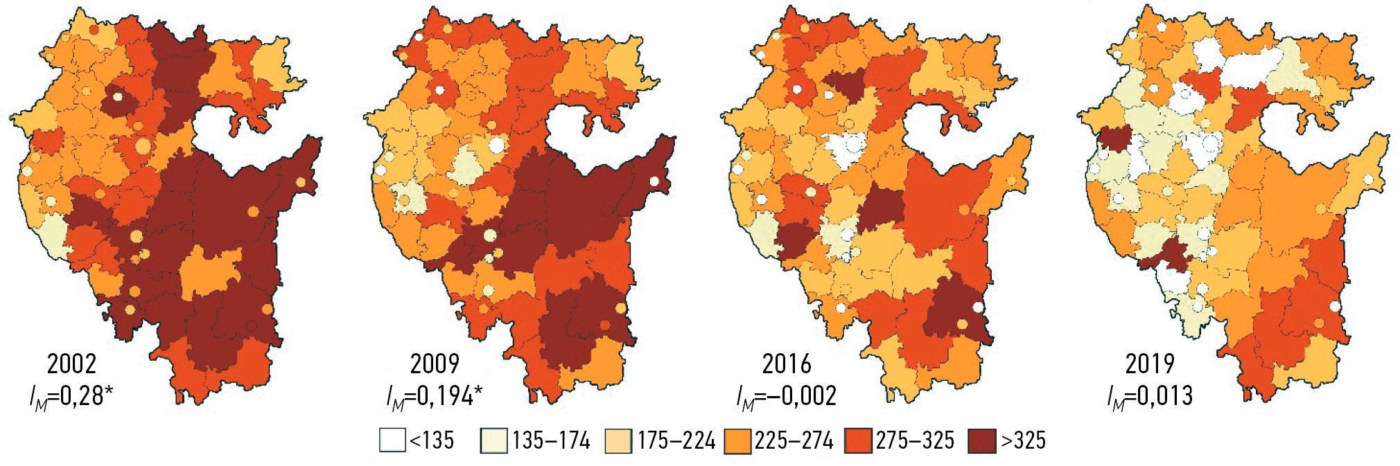 Рис. 3. Смертность населения трудоспособного возраста от внешних причин в 2002, 2009, 2016, 2019 гг. в Республике Башкортостан на 100 тыс. населения; * статистическая значимость глобального индекса автокорреляции Морана при уровне значимости p <0,001.