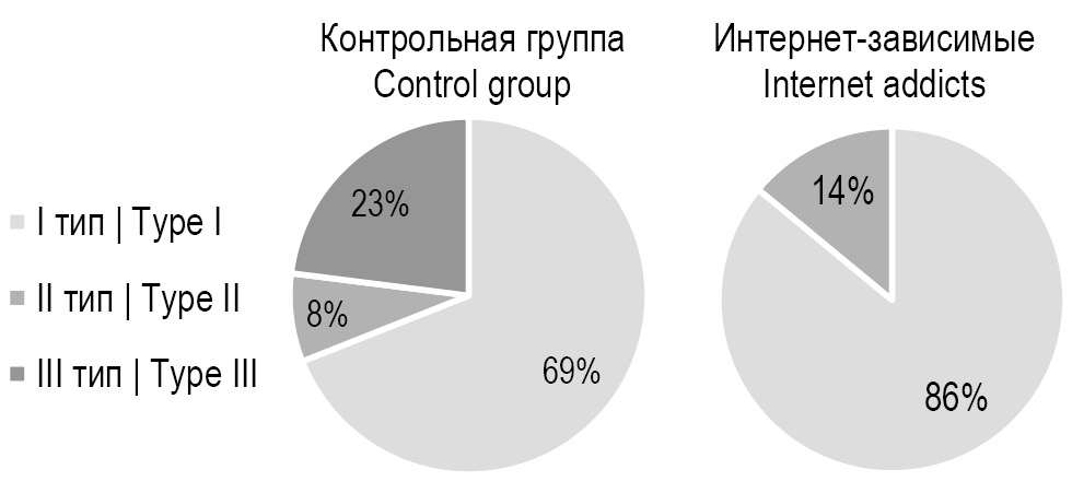 Выявленное нами распределение по типам ЭЭГ в группе интернет-зависимых юношей указывает на хорошую сформированность биоэлектрической активности мозга, что соответствует оптимальному балансу между влиянием активирующих мезэнцефальных структур и синхронизирующим диэнцефальным воздействиями. Особенно такое распределение типов ЭЭГ выделяется на фоне контрольной группы, в которой до четверти выборки испытуемых имели десинхронный III тип с низкой представленностью альфа-компоненты и заменой её на тета- и бета1-ритмы.