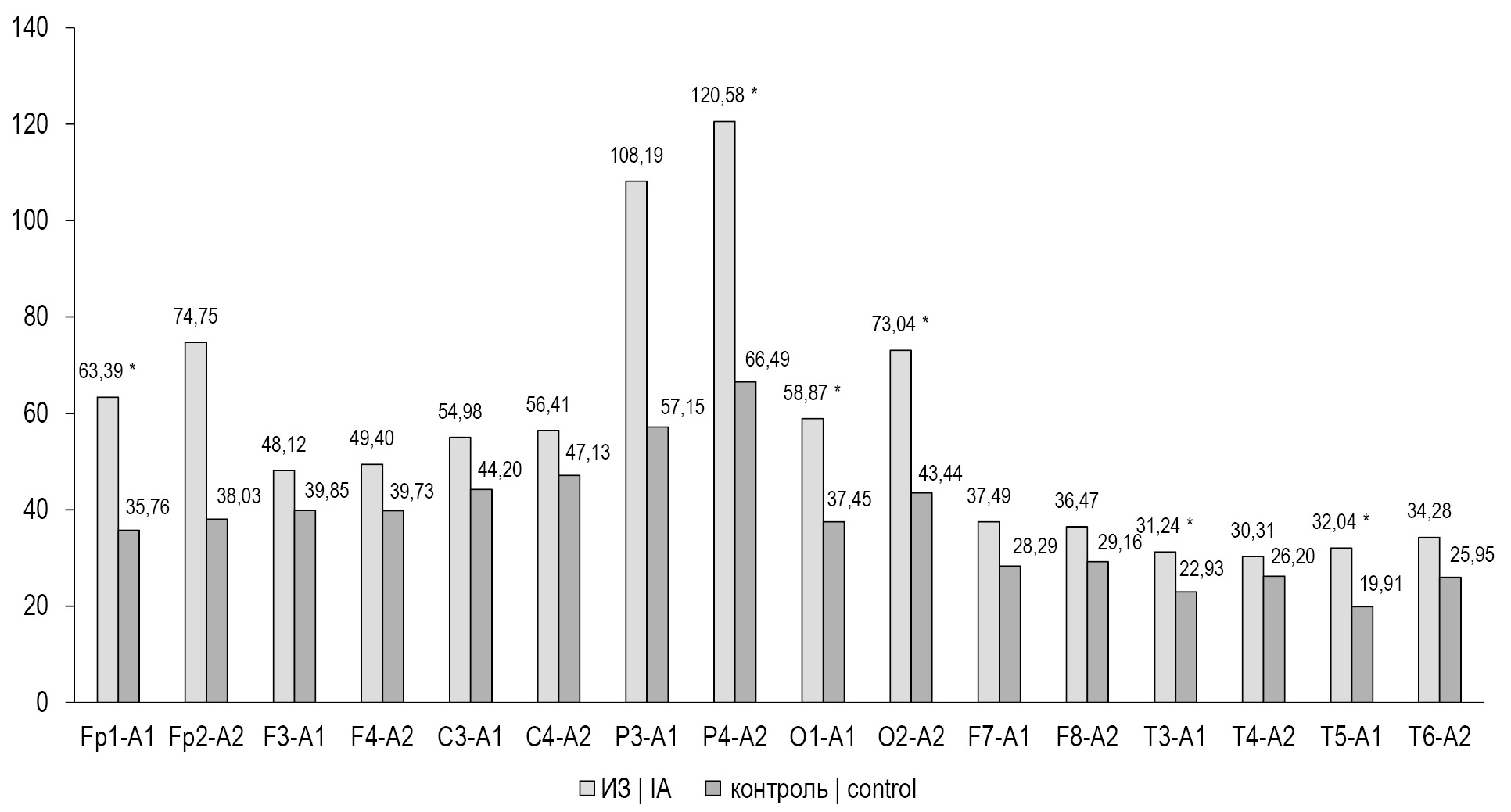 Низкочастотный дельта-ритм имел наибольшую выраженность во фронтальных: лобных, височных и центральных Fp1; Fp2; F3; F4; F7; F8; T3; T4; C3; C4 областях мозга, постепенно снижаясь к каудальным: теменным и затылочным (Р3; Р4; О1; О2) отделам, без значимых отличий между группами (приложение 1, doi: 10.17816/humeco568123-4187365).