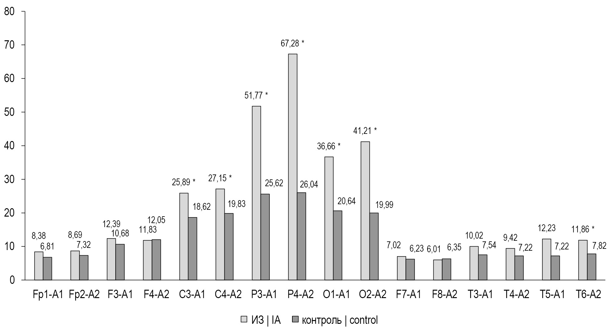 Рис. 2. Полная мощность спектра (диапазон 0,5–35 Гц), мкВ2. На графике представлены медианные значения: ИЗ — интернет-зависимые; контроль — контрольная группа; * статистическая значимость отличий показателей аддиктов от контрольной группы (статистические данные в тексте).
