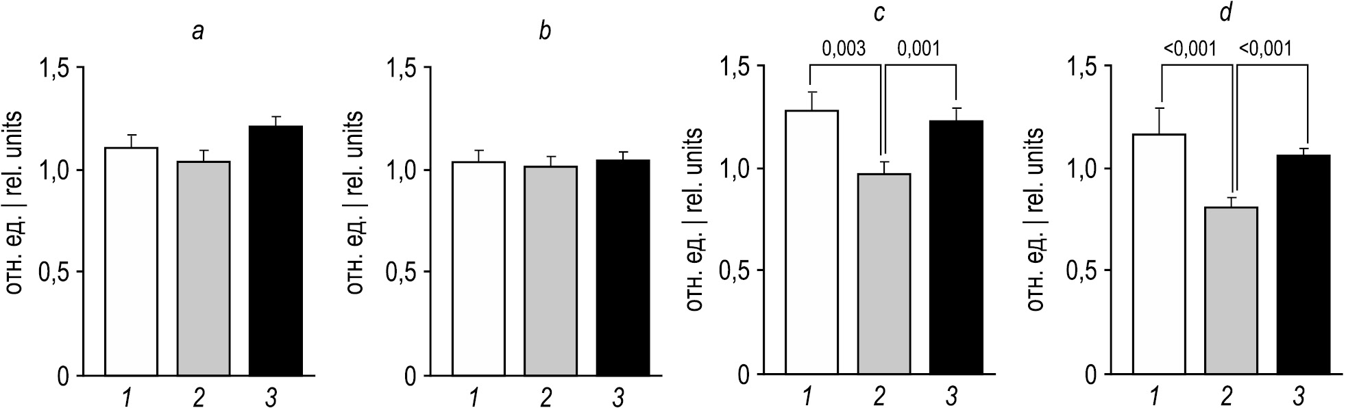 Рис. 1. Относительное содержание мРНК генов в отдалённые сроки у лиц, подвергшихся хроническому радиационному облучению в разные периоды онтогенеза; между группами представлено p-значение для U-критерия Манни–Уитни: a — TP53; b — ATM; c — MDM2; d — CDKN1A. 1 — группа сравнения; 2 — облучённые in utero и в постнатальном периоде; 3 — облучённые только в постнатальном периоде.