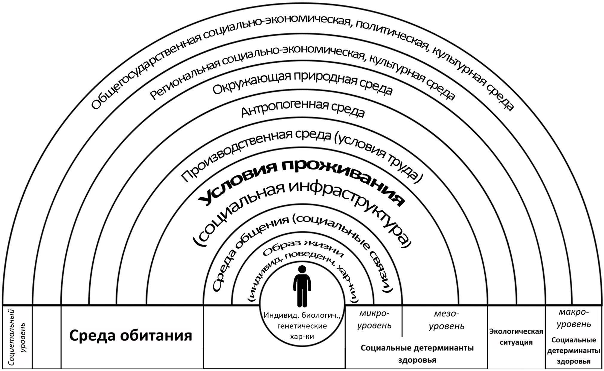 На рис. 1 представлена новая концептуальная восьмиуровневая модель детерминант здоровья человека, обозначающая место условий проживания (социальной инфраструктуры) во фрейме среды обитания и разграничивающая социальные детерминанты здоровья микро-, мезо- и макроуровней. Согласно представленной модели социальные факторы среды обитания (социальная инфраструктура), формирующие условия проживания, относятся к социальным детерминантам здоровья мезоуровня. Модель построена в развитии идей G. Dahlgren & M. Whitehead [2] и U. Bronfenbrenner [3].