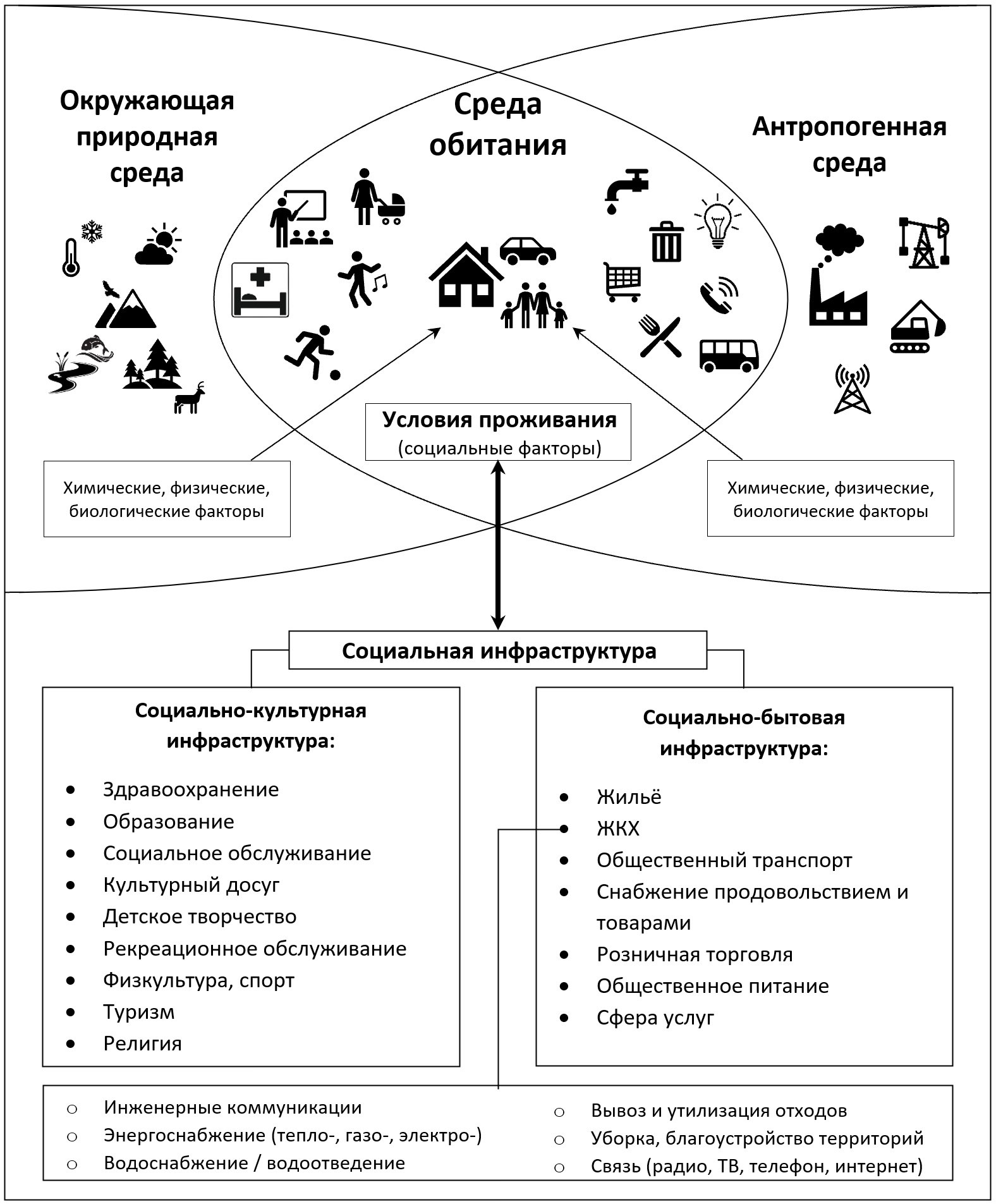 Fig. 2. Living conditions in a settlement as a set of components of social infrastructure (social factors of the habitat) at the junction of the natural and anthropogenic environments.