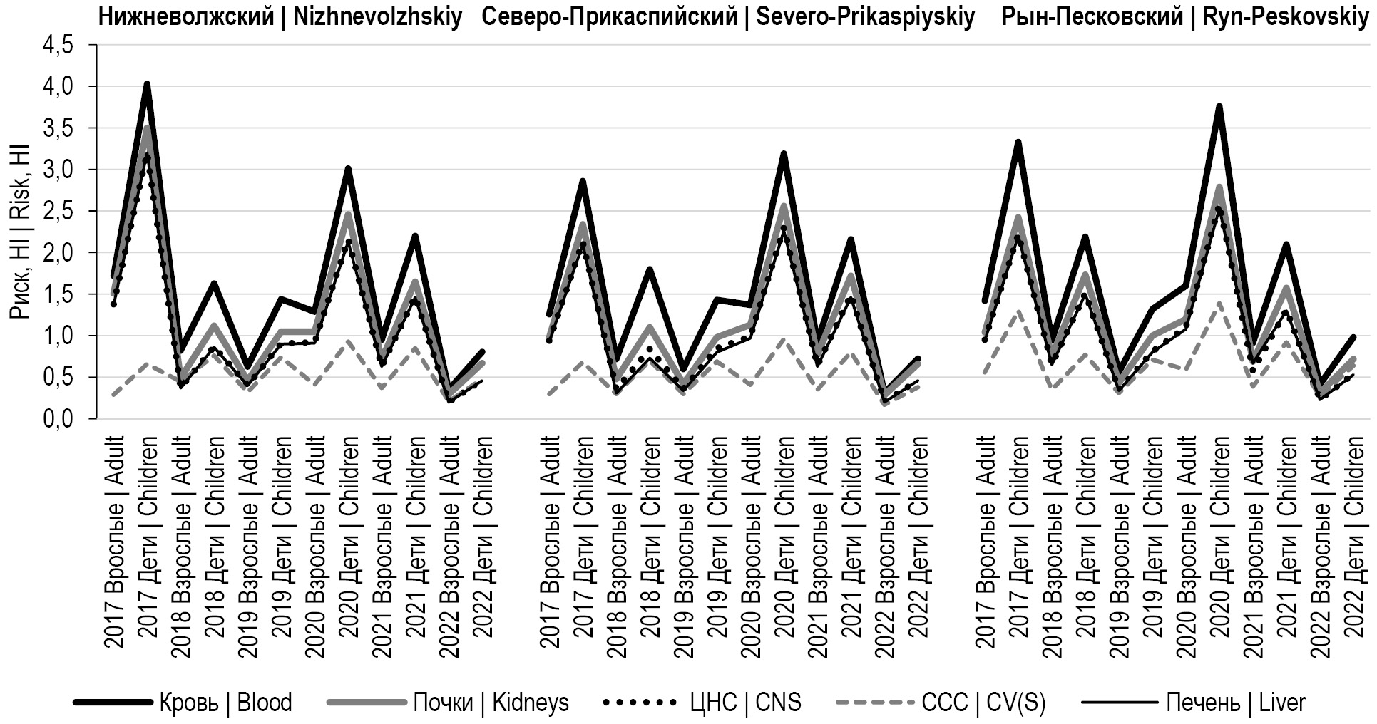 Многолетняя картина риска развития неканцерогенных эффектов со стороны крови, почек, сердечно-сосудистой и центральной нервной систем демонстрировала сходную динамику. Минимальные значения риска, рассчитанные с учётом сонаправленного действия токсикантов, относились к сердечно-сосудистой системе, что объясняется отсутствием вклада хлороформа в этот феномен. Превышение допустимого уровня HIссс выявлено для детей лишь на территории Рын-Песковского бассейна III порядка в 2017 и 2020 гг. (HIдет/ссс=1,30; HIдет/ссс=1,39, соответственно). Максимальные уровни были отмечены для крови на протяжении всего изучаемого диапазона времени (2017–2022 гг.). В Нижневолжском бассейне наибольшее значение для данной критической системы зарегистрировано в 2017 г. (HIвзр/кровь=1,51; HIдет/кровь=4,03), в Северо-Прикаспийском и Рын-Песковском бассейнах пиковые величины относились к 2020 г. (HIвзр/кровь=1,26, HIдет/кровь=2,86; HIвзр/кровь=1,42, HIдет/кровь=3,33, соответственно). Необходимо отметить, что в 2019 г. значения HI, превышающие единицу, были отмечены лишь для детей: Нижневолжский бассейн, HIдет/кровь=1,63; Северо-Прикаспийский, HIдет/кровь=1,43; Рын-Песковский, HIдет/кровь=1,32. Таким образом, значение суммарного риска здоровью ∑HI на всех территориях Северо-Каспийской подпровинции залегания подземных вод достоверно увеличилось (диапазон 2019–2020 гг.) как для взрослых, так и для детей (взрослые: Тнабл=9,80, Ткрит=4,30, р <0,05; дети: Тнабл=11,80, Ткрит=9,92, р <0,01). В 2022 г. превышение допустимых уровней неканцерогенного риска не было зарегистрировано ни для одной из критических систем: достоверная отрицательная динамика риска сохранялась во временнÓм отрезке 2020–2022 гг. при р <0,01 (взрослые: Тнабл=21,50, Ткрит=9,92; дети: Тнабл=20,60, Ткрит=9,92).