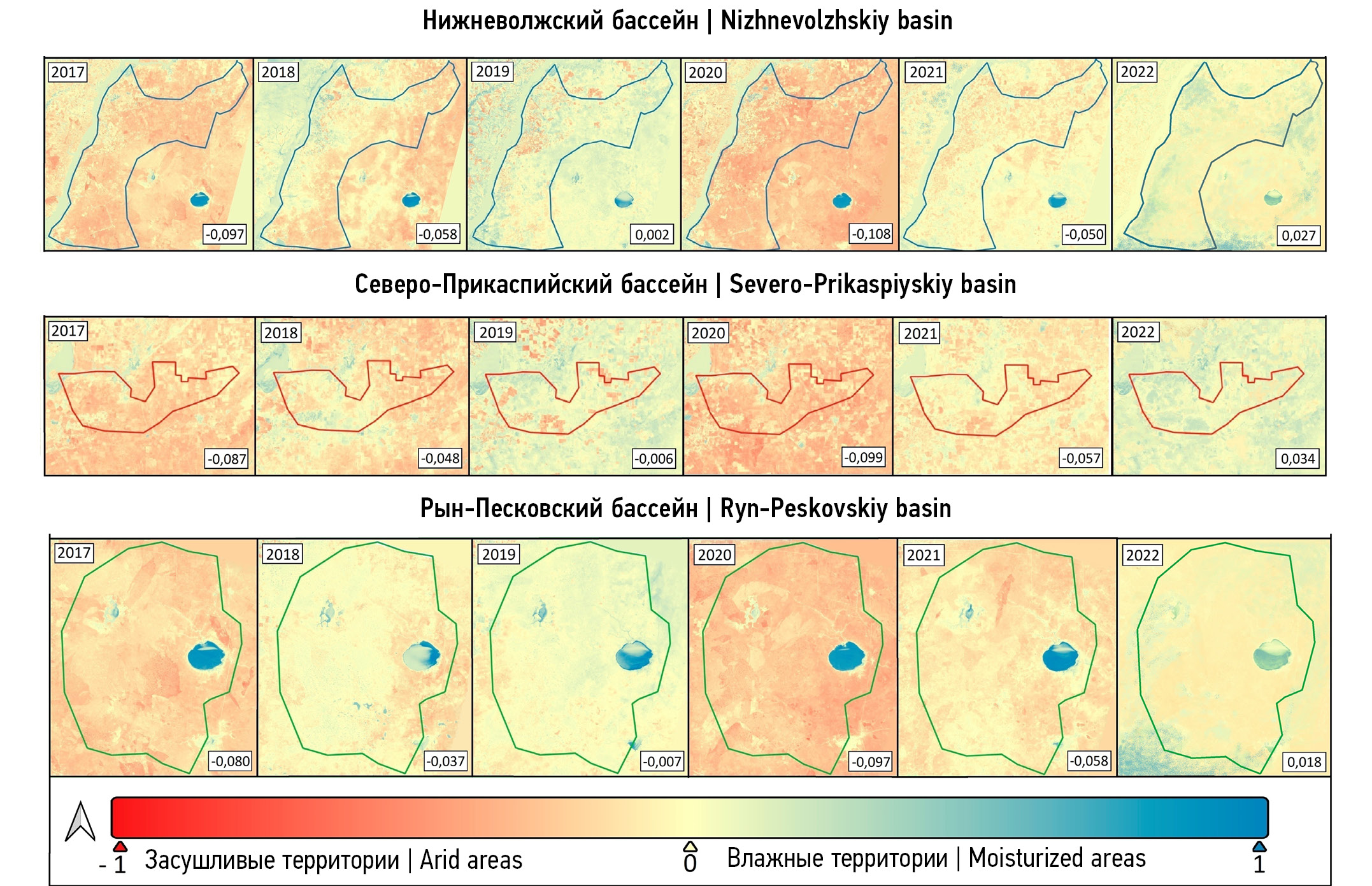 Принимая во внимание значимые отличия между показателями неканцерогенного риска в разные годы и гидрогеологические особенности волгоградского Заволжья, мы произвели вычисление спутникового индекса засушливости NDMI — первого признак-фактора регрессионной модели (х1). Для каждого из трёх бассейнов III порядка был создан векторный слой для расчёта зональной статистики растра с диапазоном вариации индекса от –1 (засушливые территории) до 1 (увлажнённые территории) (рис. 3).