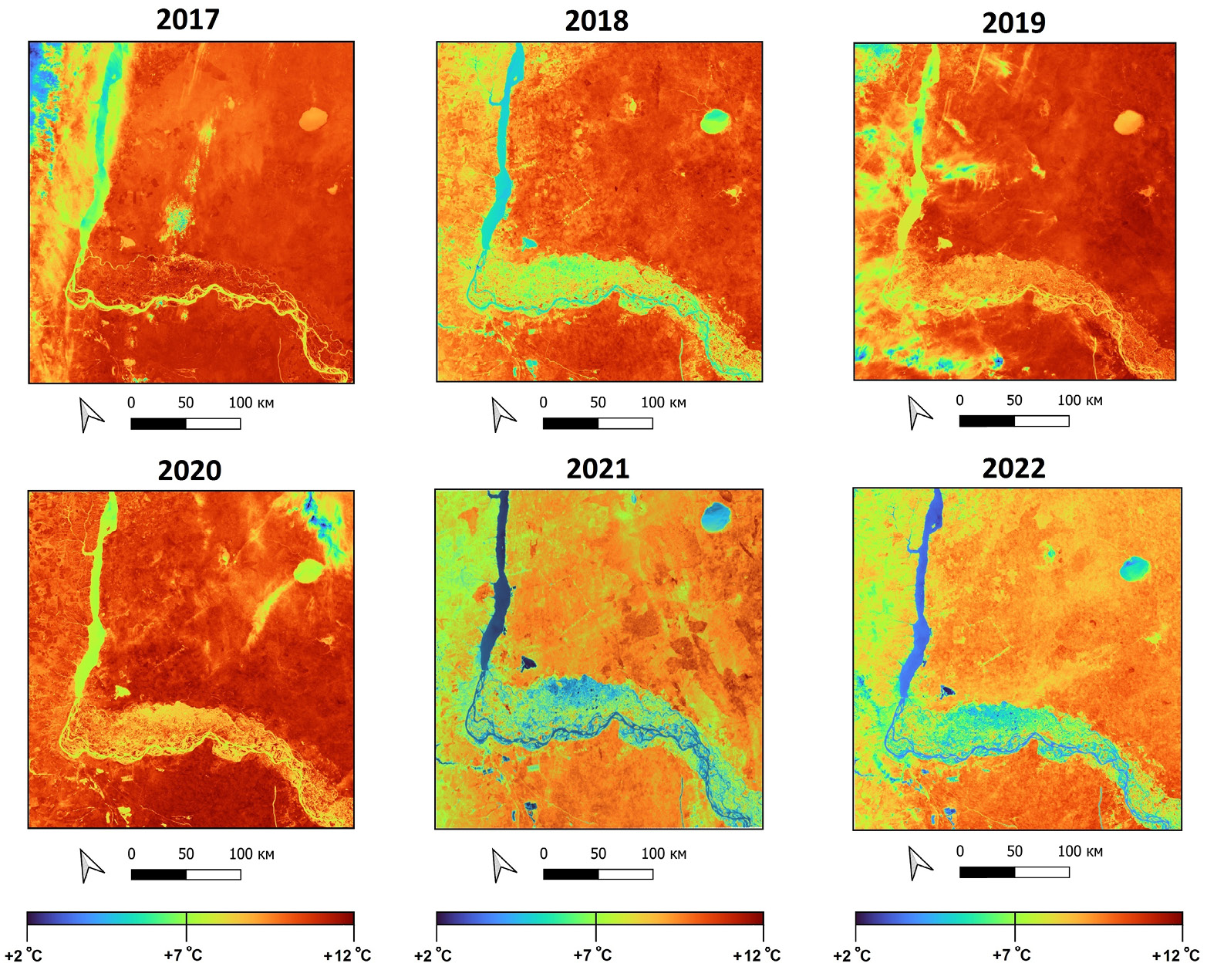 Рис. 4. Растровые карты показателя LST в волгоградском Заволжье (2017–2022 гг.).